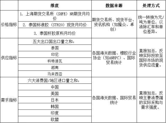 (5)进口量(需求端):汇总中国、美国、日本、韩国、印度、欧盟六个主要消费国家/地区的月度橡胶进口量(吨)。选取理由:这些国家/地区是全球主要的天然橡胶消费市场,其进口需求直接决定了全球需求的强弱,对价格有决定性影响。