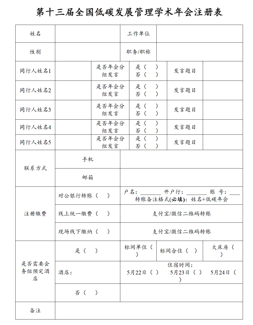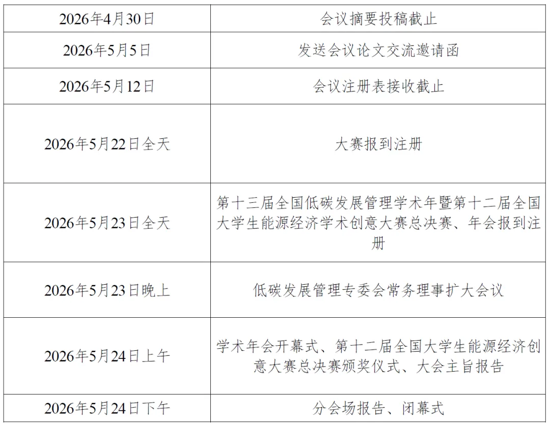 4.请将填好的注册表和支付凭证发送至邮箱energy_eco@126.com,格式为:姓名+单位+第十三届低碳管理年会注册表,截止日期为2026年5月12日;