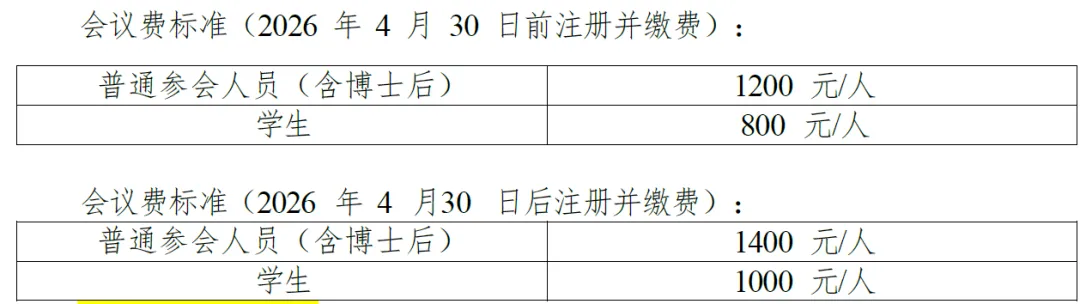 2.注册费收费标准。2026年4月30日前完成注册并缴费:普通参会人员(含博士后):1200元/人;在校学生:800元/人。2026年4月30日后注册并缴费:普通参会人员(含博士后):1400元/人;在校学生:1000元/人;