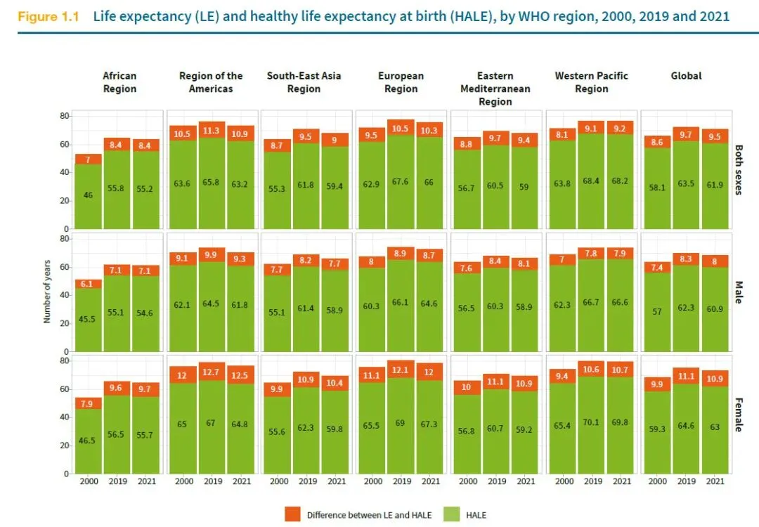 图. 2000年、2019年和2021年的预期寿命和健康预期寿命
