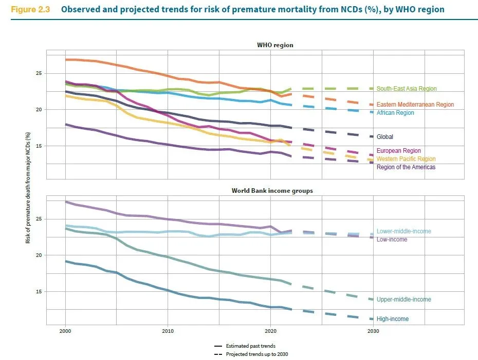 受人口增长和老龄化的影响,心脏病、中风、糖尿病和癌症等非传染性疾病造成的过早死亡人数在不断增加。目前,非传染性疾病已成为全球70岁以下人群死亡的主要原因。