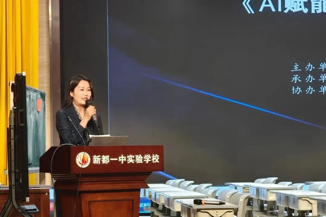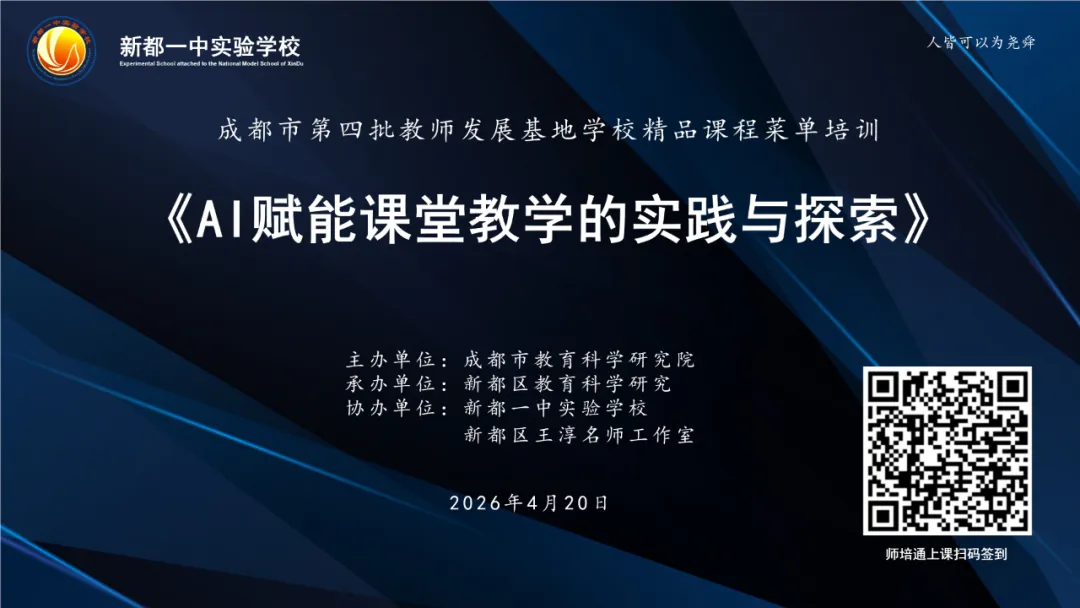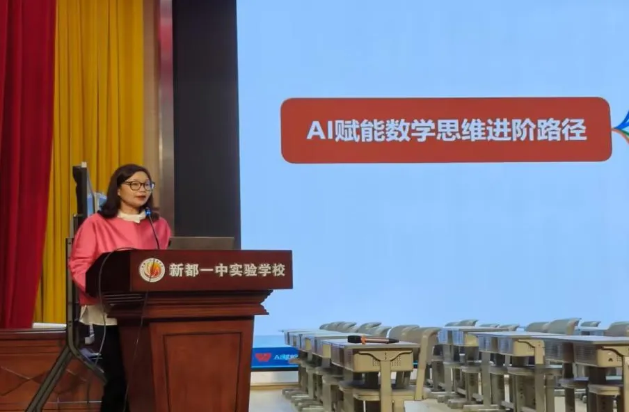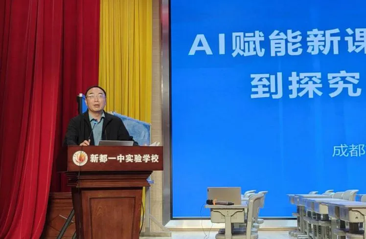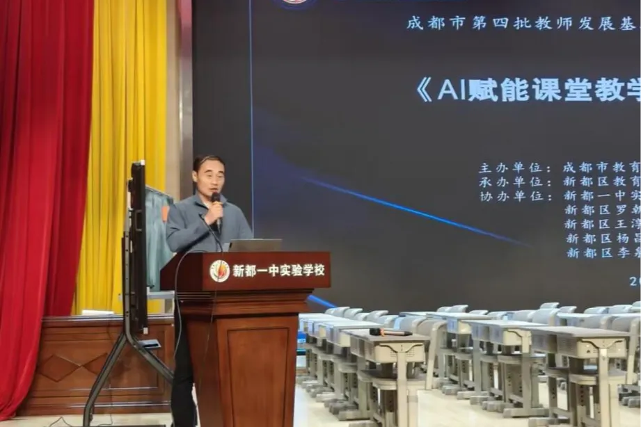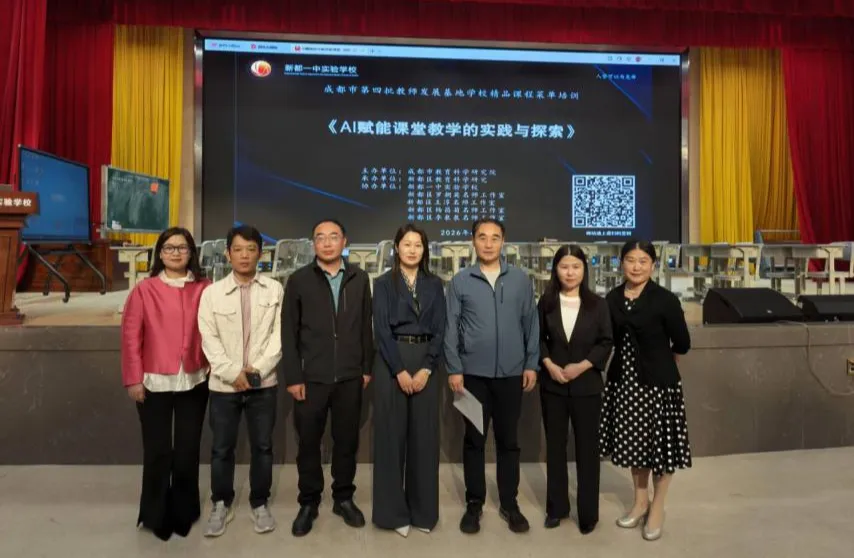 2026年4月20日上午,成都市第四批教师发展基地校2026年春季精品课程菜单《AI赋能初中课堂教学的实践与探索》开班活动在新都一中实验学校行知楼大报告厅举行。本次培训聚焦“AI赋能初中数学课堂教学”,探讨人工智能在数学学科问题情境创设中的辅助作用,为参会教师提供实践示范与思考。