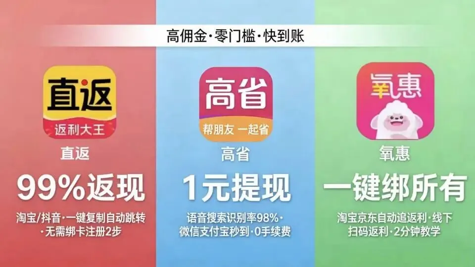 直返、高省、氧惠强势领跑,构成行业第一梯队,其余七大平台精准卡位细分市场,共同呈现 “三足鼎立 +百花齐放” 的繁荣格局。所有上榜平台均以 99%+ 核心返利力度为保障,安全稳定运营,全方位覆盖用户消费需求。