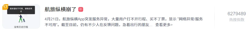4月21日中午,航旅纵横App突发服务异常,大量用户打不开行程、买不了票,显示 “服务暂时不可用,请稍后再试”。
