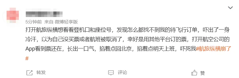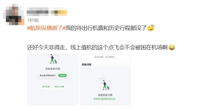 不少旅客在社交平台分享称,自己在航旅纵横平台上待出行信息及历史行程信息都不见了。