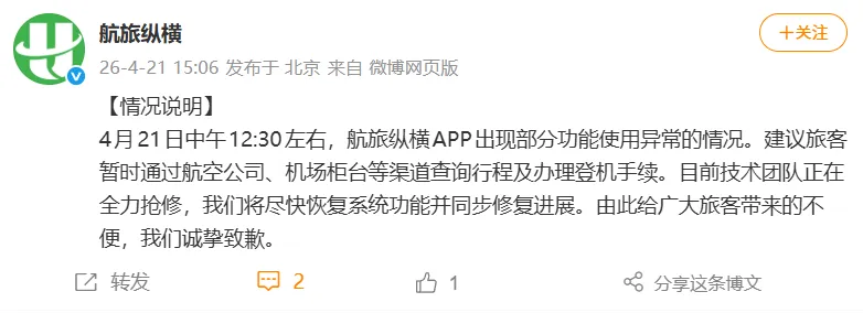 15:06航旅纵横发布公告表示,4月21日中午12:30左右,航旅纵横APP出现部分功能使用异常的情况。