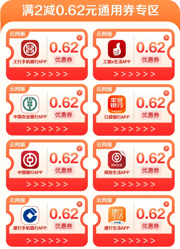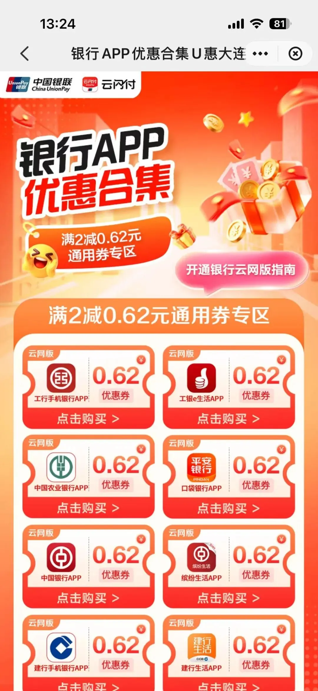 1分钱办大事!多家银行APP(云网版)立减0.62元!