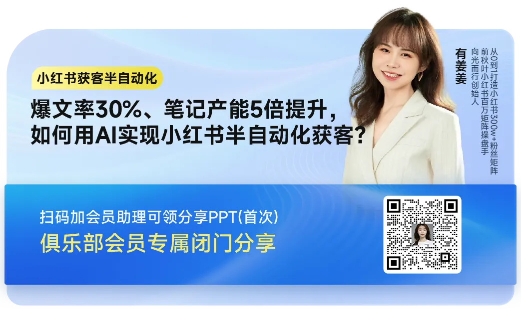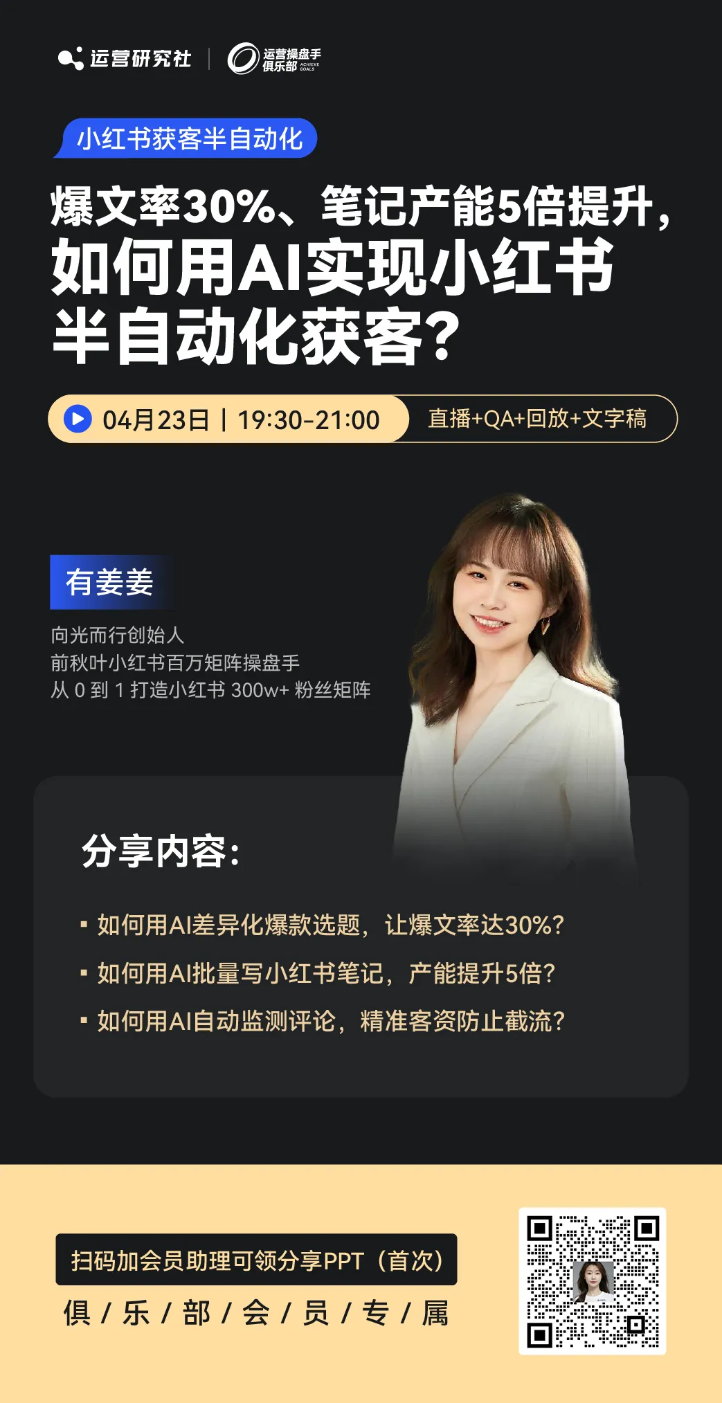 4月23日,有姜姜会在俱乐部里详细分享从爆款选题到笔记批量产出到评论监测客资,如何用AI实现小红书半自动化运营。感兴趣的伙伴欢迎扫码添加会员助理咨询解锁。