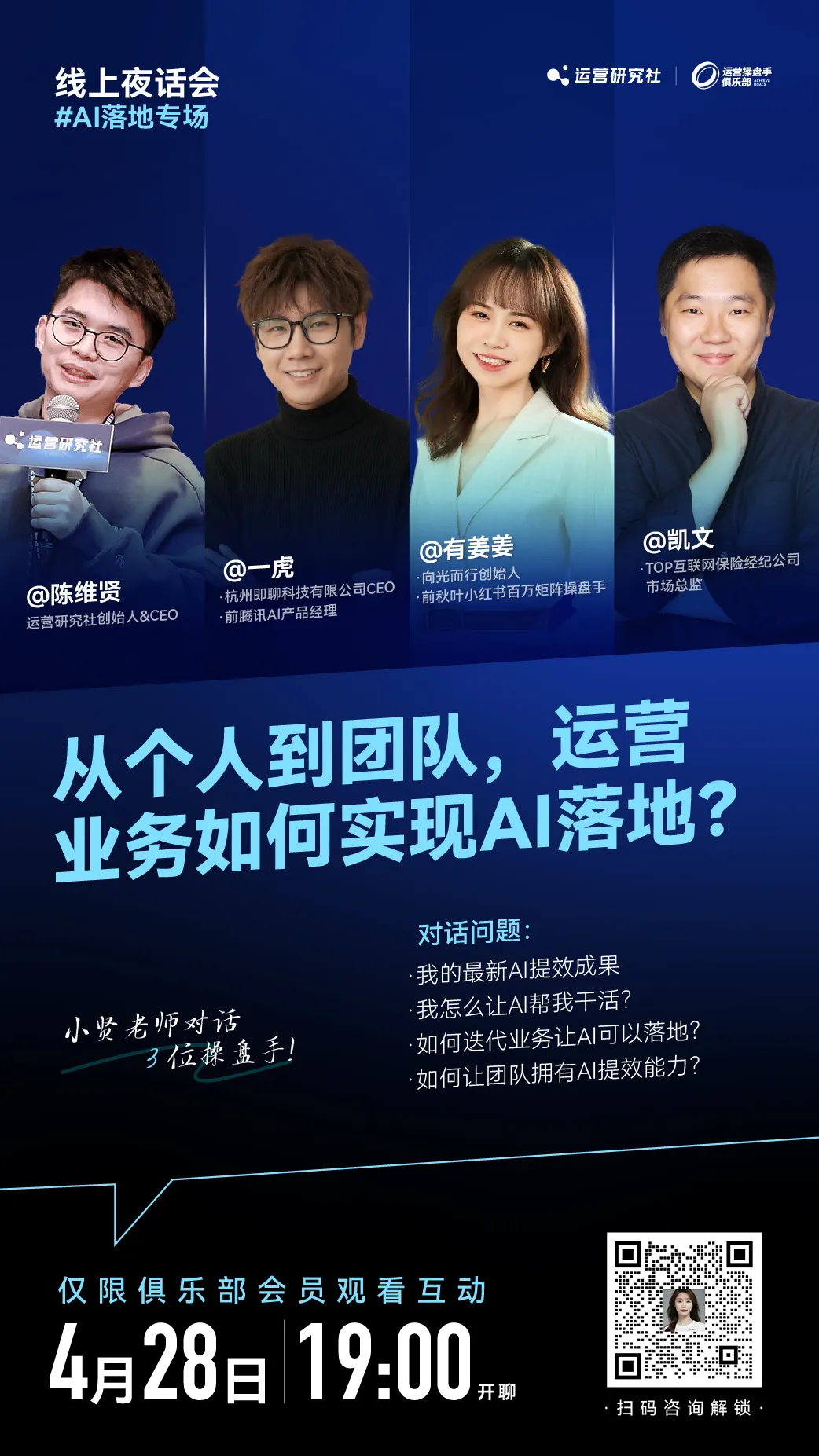 4月28日,运营社创始人@小贤还会和有姜姜在内的3位AI实践者一起对话: