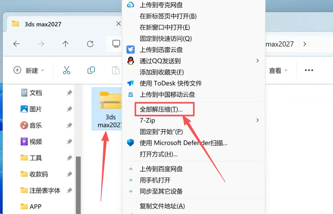1、鼠标右键选择3dsmax2027安装包,点击全部解压缩!