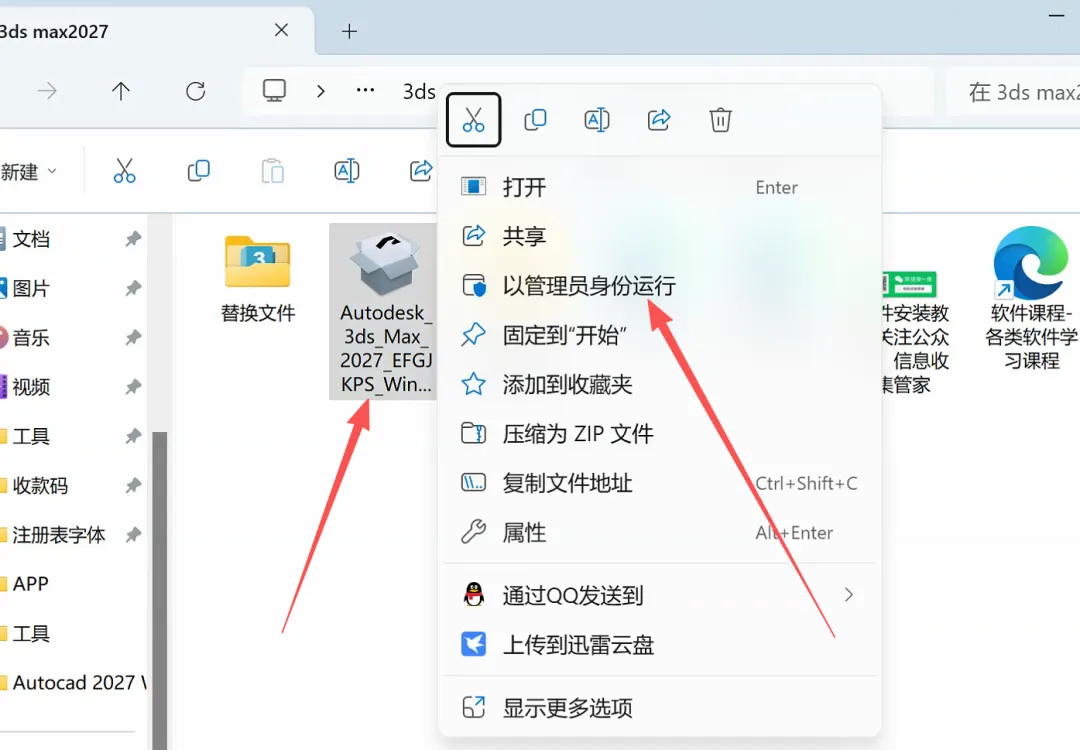 2、右键管理身份运【Autodesk_3ds_Max_2027_EFGJKPS_Win_64bit_db_001_002】安装程序。