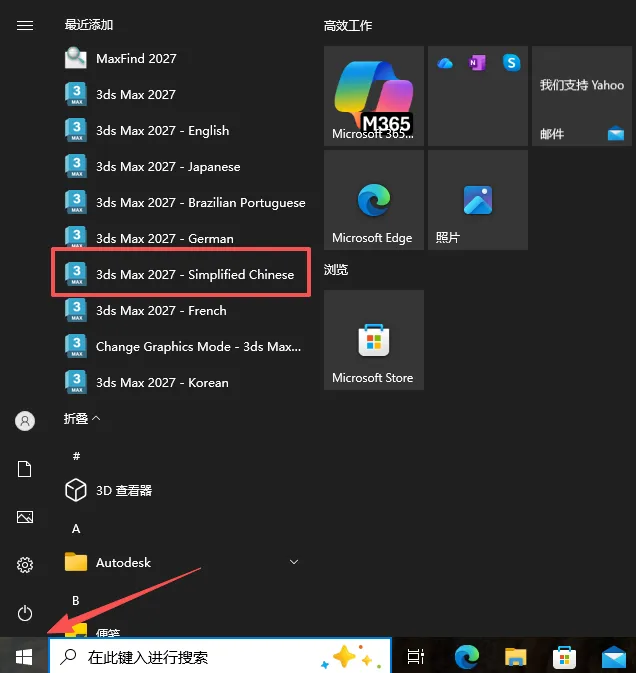 10、在开始菜单中点击3ds Max 2027 -Simplified Chinese(中文语言),启动3ds Max 2027。