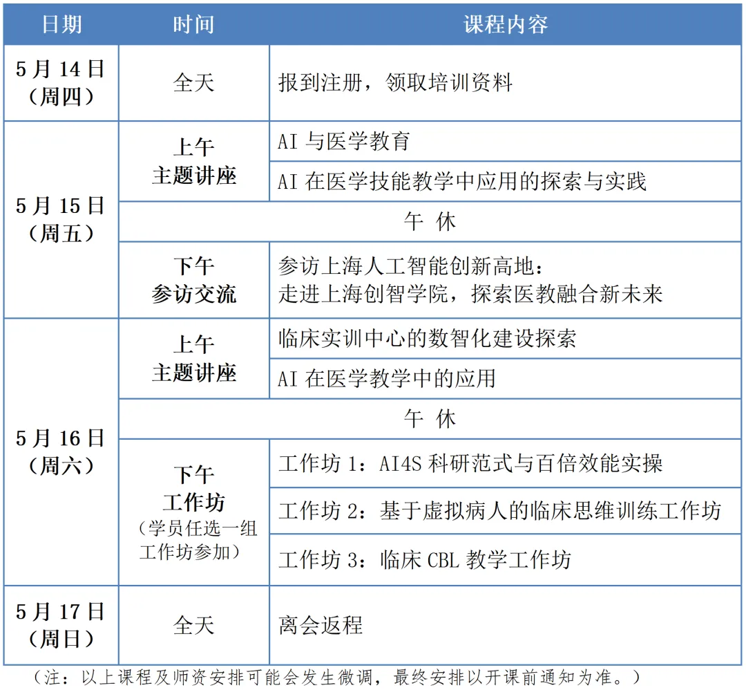 为全面落实《国务院关于深入实施“人工智能+”行动的意见》(国发〔2025〕11号)及教育部等五部门关于印发《“人工智能+教育”行动计划》的通知(教科信〔2026〕1号)》要求,推动人工智能与临床医疗、医学教育深度融合,强化临床骨干师资在AI时代的教学创新能力与岗位胜任力,培养兼具临床专业素养与AI技术应用能力的复合型师资队伍,助力医疗机构高质量发展,上海交通大学医学院决定于2026年5月14日-17日举办“2026年AI赋能临床教师岗位胜任力专题培训班(第1期)”。