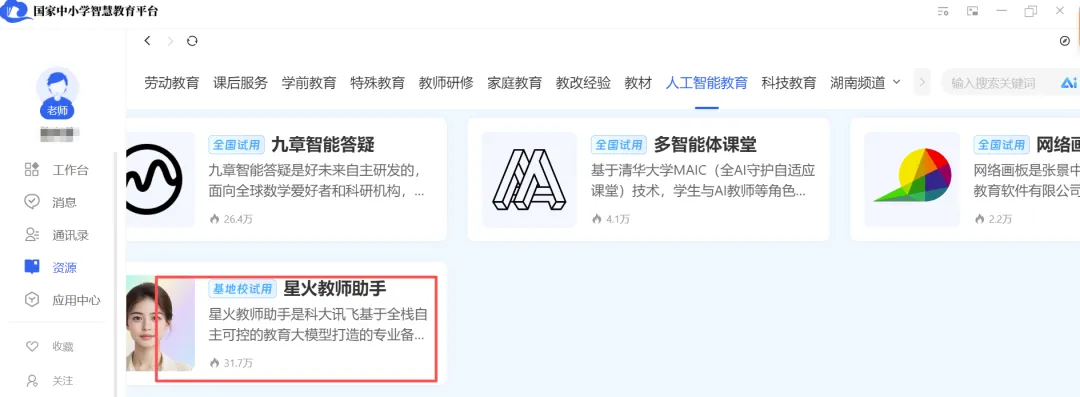 国家中小学智慧教育平台的“用AI”板块已经嵌入星火AI,但只支持基地校使用。