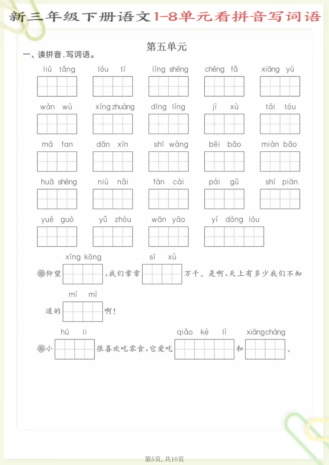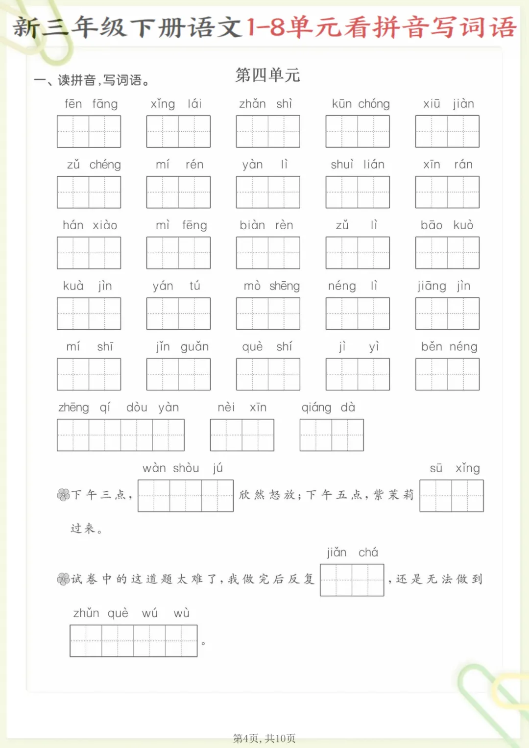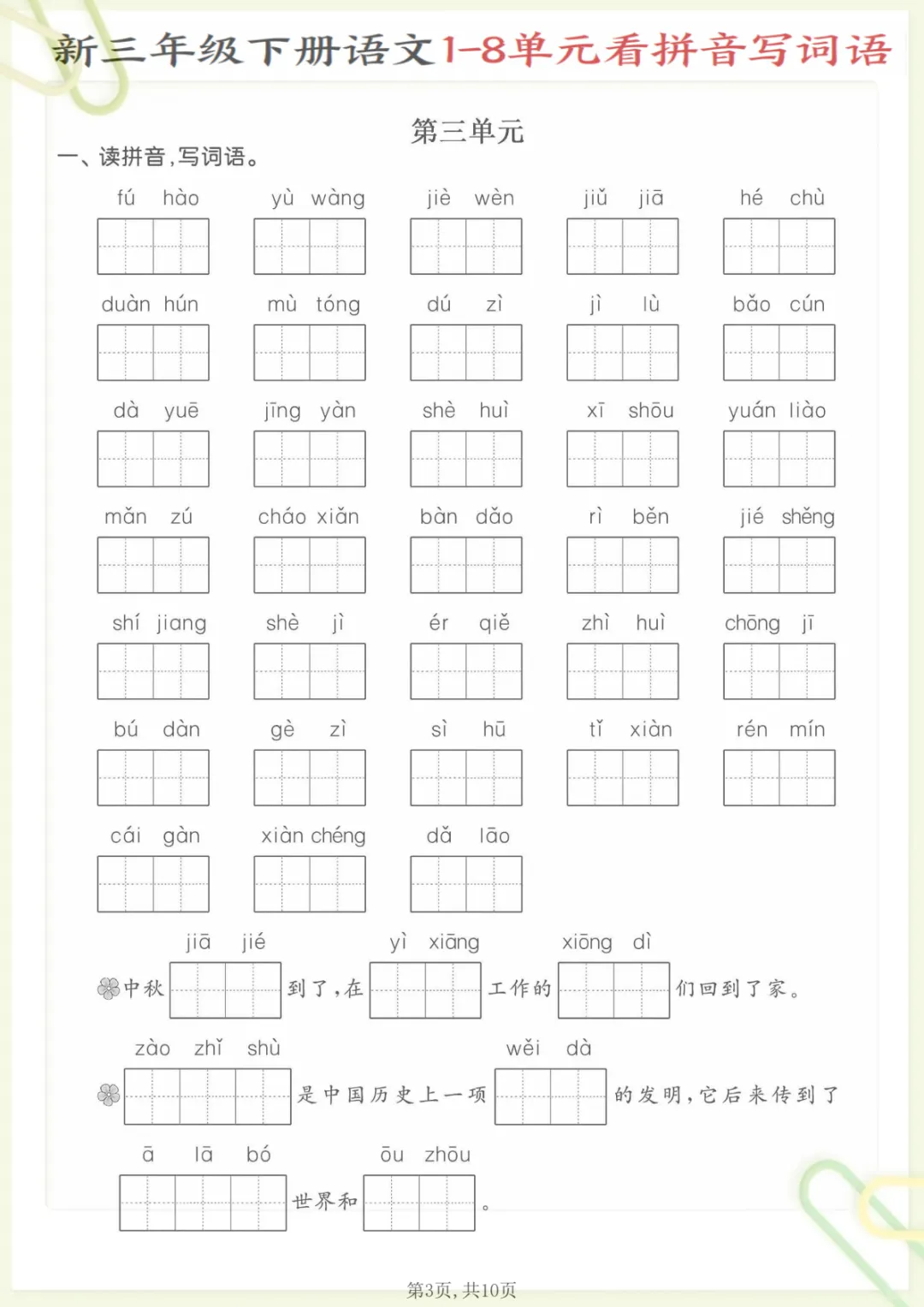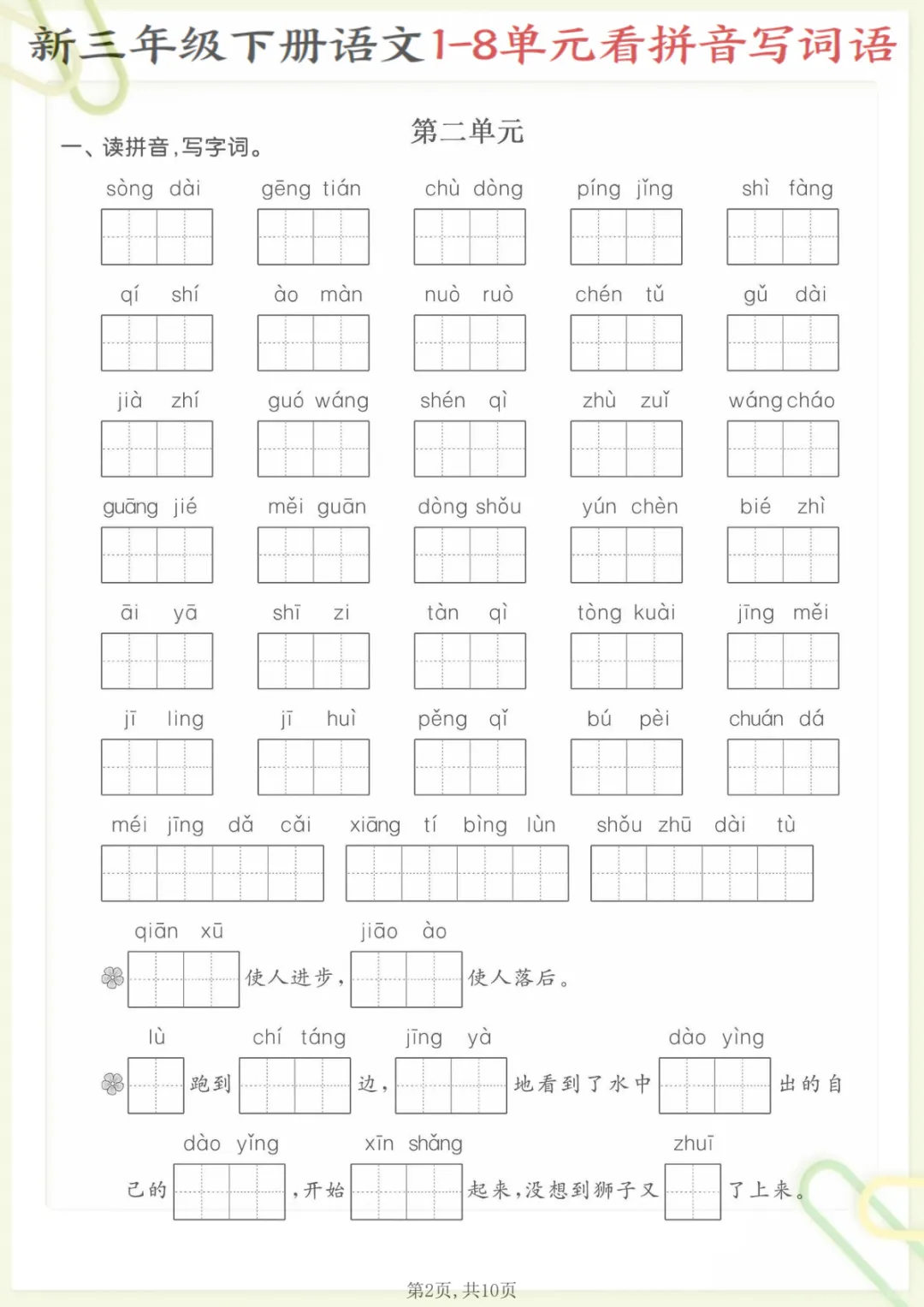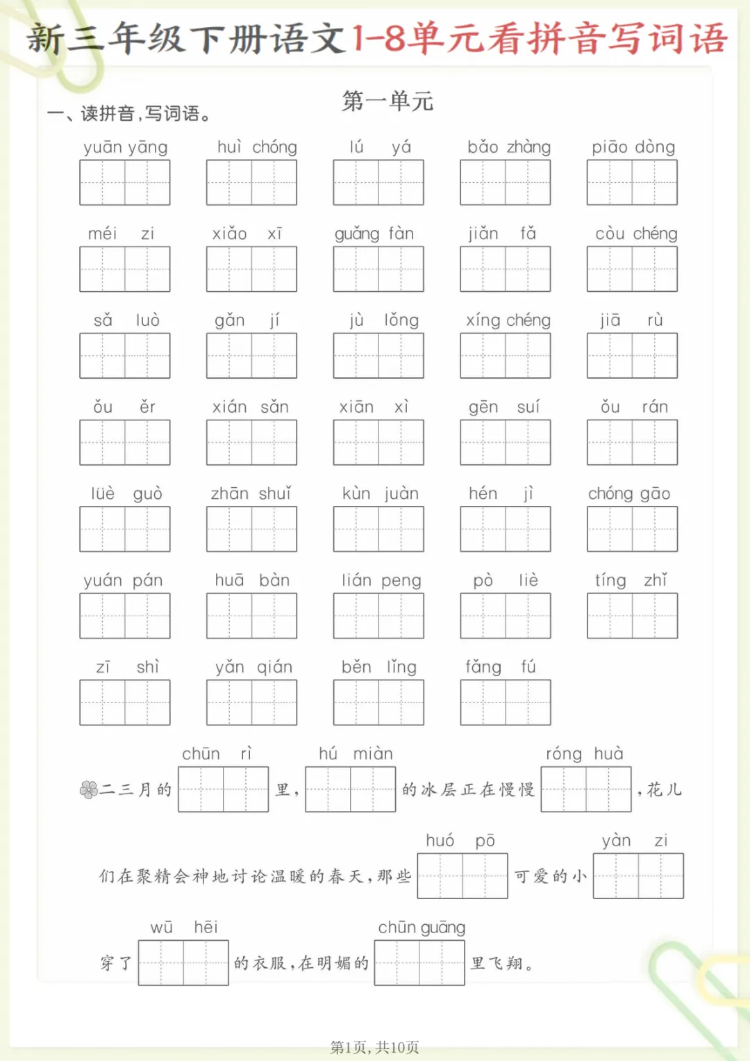 三年级下语文1—8单元看拼音写词语,共10页,电子版可下载可打印,这份资料紧扣三年级下册语文1—8单元字词学习,主要围绕看拼音写词语这一专项进行训练,帮助孩子在练习中巩固课内生字词、加强拼音识记与词语书写能力,进一步夯实单元基础内容。很适合家长在课后给孩子查漏补缺、同步复习,有需要的家长可以及时下载打印,让孩子认真练一练。