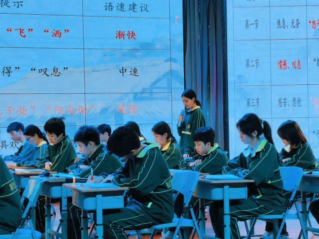 张怡真老师携803 班全体学生,带来八年级语文经典示范课《茅屋为秋风所破歌》。课堂以课前演讲《当我走近你》温情开篇,迅速带入诗圣心境。以吟咏・诗心共情韵、解诗・诗事见沧桑、赏诗・诗心映现实、怀仁・诗魂照古今四大任务驱动,融诵读、探究、创想、对话于一体,让千年经典焕发新生。