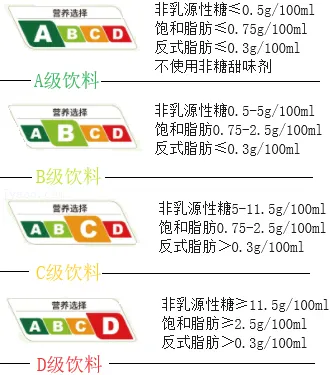 ㅤㅤ根据饮料中“非乳源性糖”“饱和脂肪”“反式脂肪”“非糖甜味剂”等4种成分含量,评定等级从高至低,标识ABCD四级,推荐程度逐步递减。消费者在购买饮料时,只要看到标识就能了解营养成分。此次分级考虑的4项成分都是需要适量或限量摄入的,因此在评定等级的判定上,需要取最低等级作为最终的总体级别。
