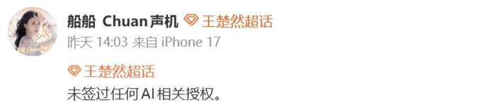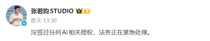 在相关报道中被提及的多位艺人,也通过其工作室、官方后援会等账号发布声明,否认签署AI相关授权。