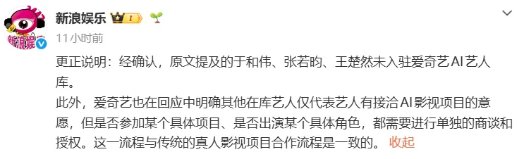 “新浪娱乐”账号21日凌晨发文作出更正说明称:“经确认,原文提及的于和伟、张若昀、王楚然未入驻爱奇艺AI艺人库。”