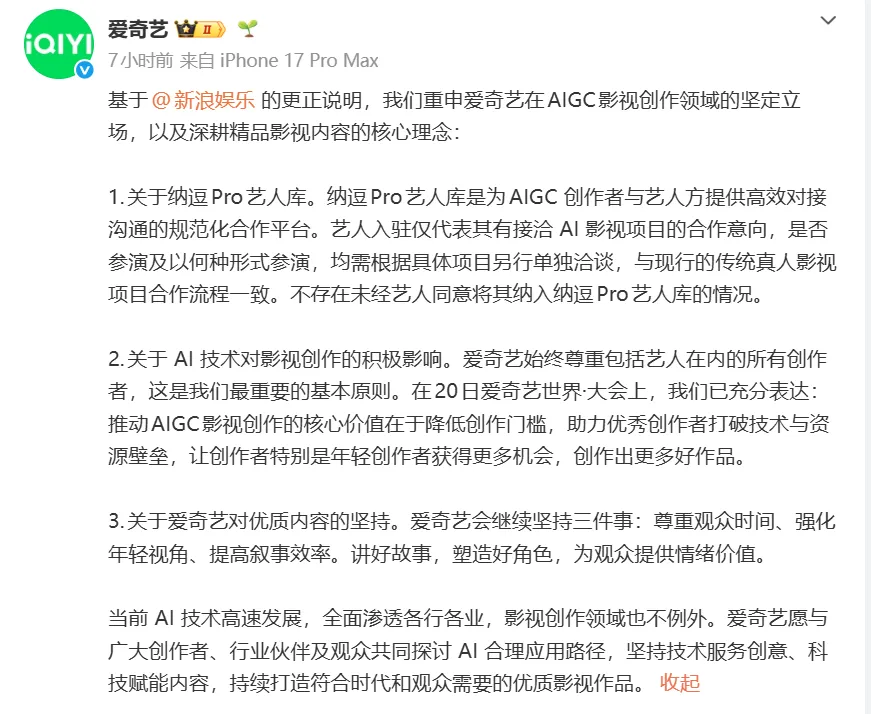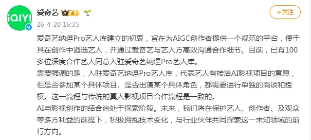 20日下午,针对“AI艺人库”方面的争议,爱奇艺在其官方微博发文:“目前,已有100多位深度合作艺人同意入驻爱奇艺纳逗Pro艺人库。