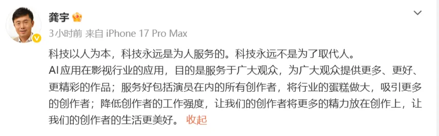 他表示,AI在影视行业的应用,目的是服务于广大观众,为广大观众提供更多、更好、更精彩的作品;服务好包括演员在内的所有创作者,将行业的蛋糕做大,吸引更多的创作者;降低创作者的工作强度,让我们的创作者将更多的精力放在创作上,让我们的创作者的生活更美好。