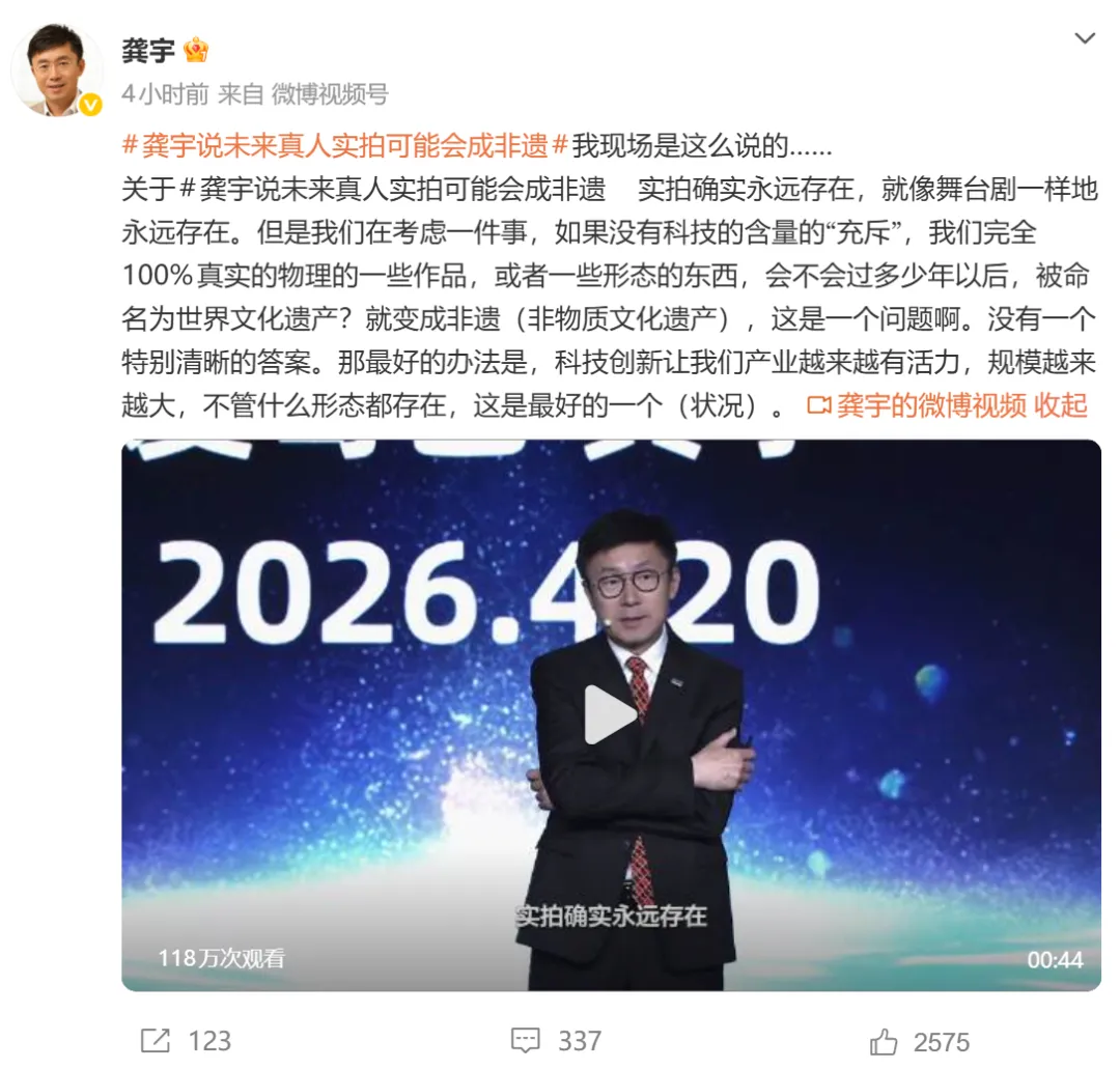 “看一个实拍会觉得特别稀有?未来影视行业可能就是这样,实拍变成少数。”4月20日,在爱奇艺世界·大会上,爱奇艺创始人、首席执行官龚宇发表演讲时称,未来真人实拍可能会成为“非遗”,但不会完全消失。