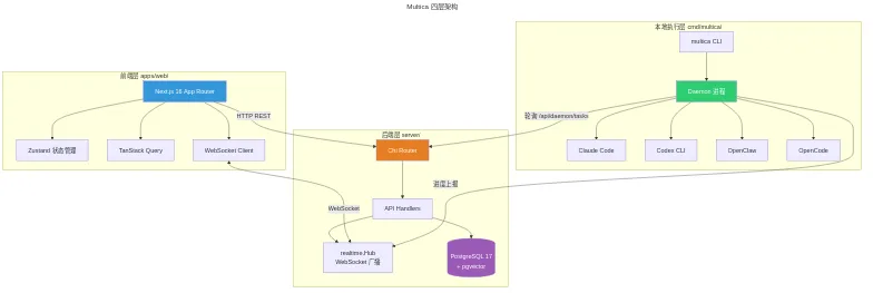 Multica 的代码库是一个 monorepo,核心分为四层。