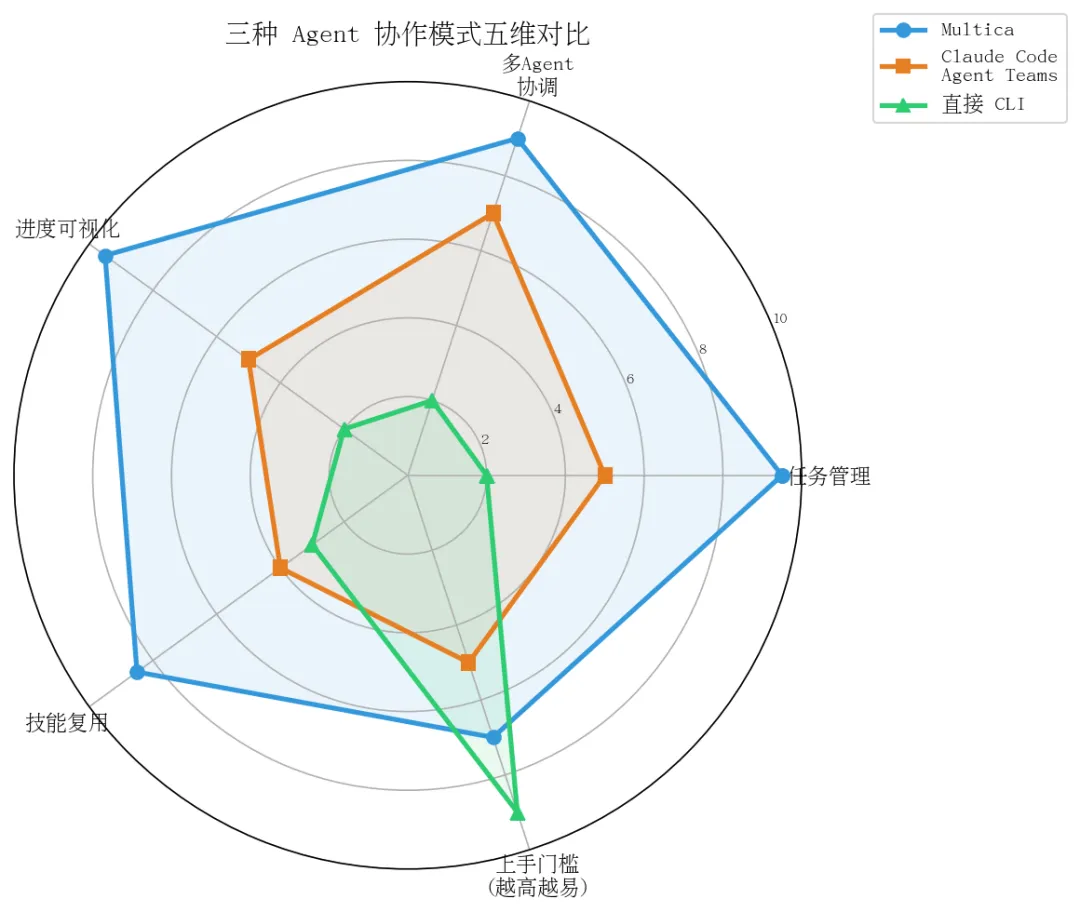 雷达图:五个维度对比Multica、Claude Code Agent Teams、直接CLI三种模式,Multica在任务管理(9.5)和进度可视化(9.5)维度接近满分,Claude Code Teams在多Agent协调(7)居中,直接CLI在上手门槛(9)最优但其他维度偏低,蓝色Multica橙色Teams绿色CLI