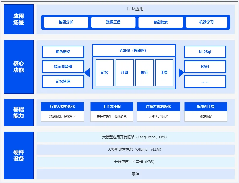 图:企业智能体四层架构——从设备层、基础能力层到核心功能层(Agent智能体:记忆、计算、执行、工具),最终支撑应用场景