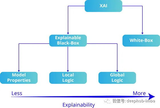 图:面向可解释AI的黑盒与白盒模型——从黑盒模型(Model Properties、Local Logic)到白盒模型(Global Logic),可解释性逐级递增