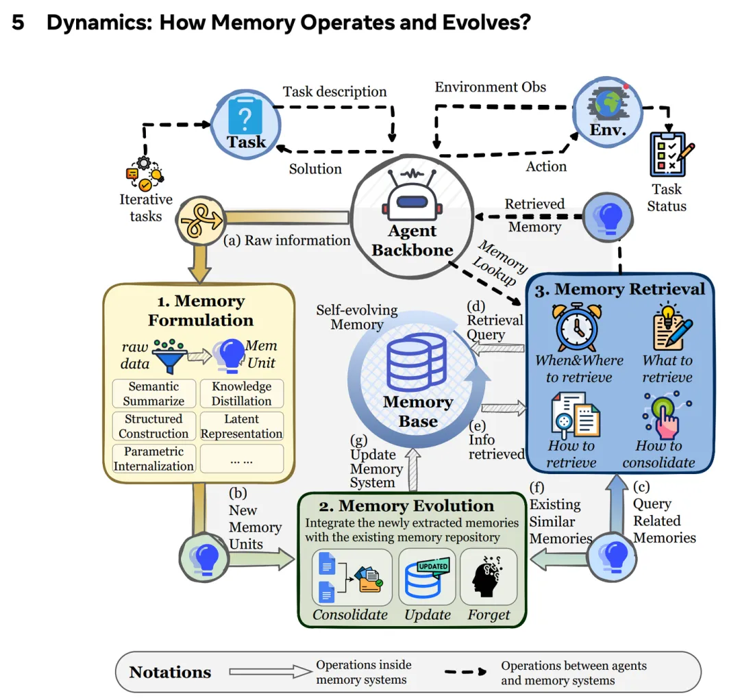 图:AI Agent记忆的运作与进化——从记忆形成(Memory Formulation)、记忆进化(Memory Evolution)到记忆检索(Memory Retrieval)的完整闭环