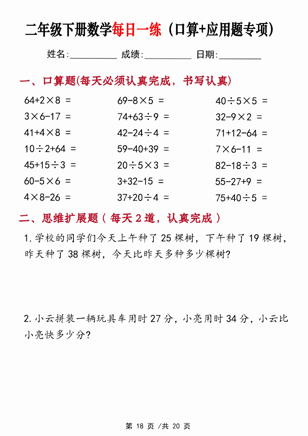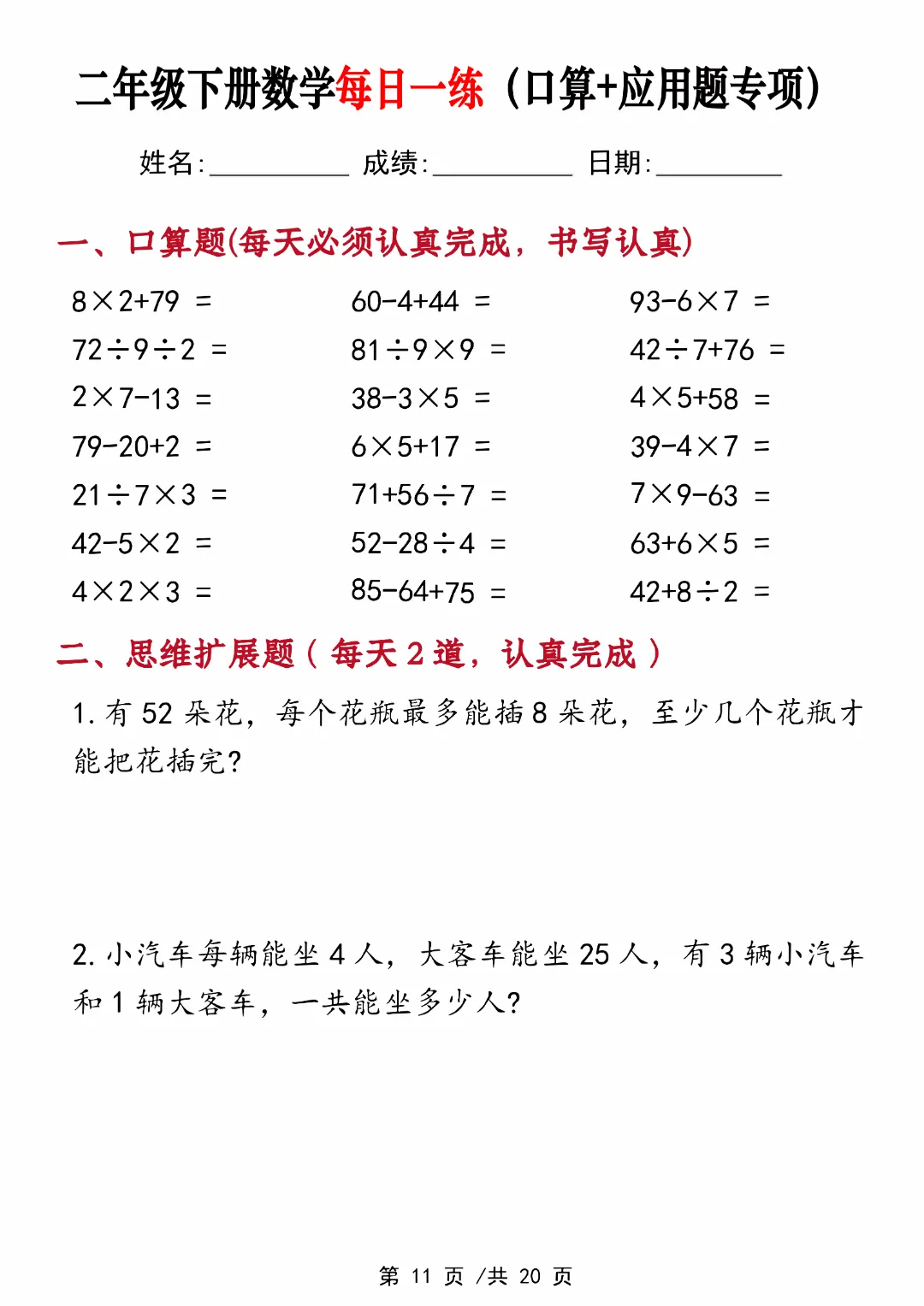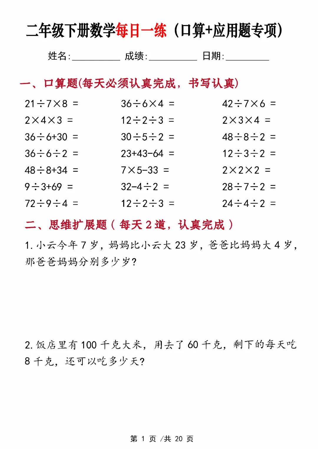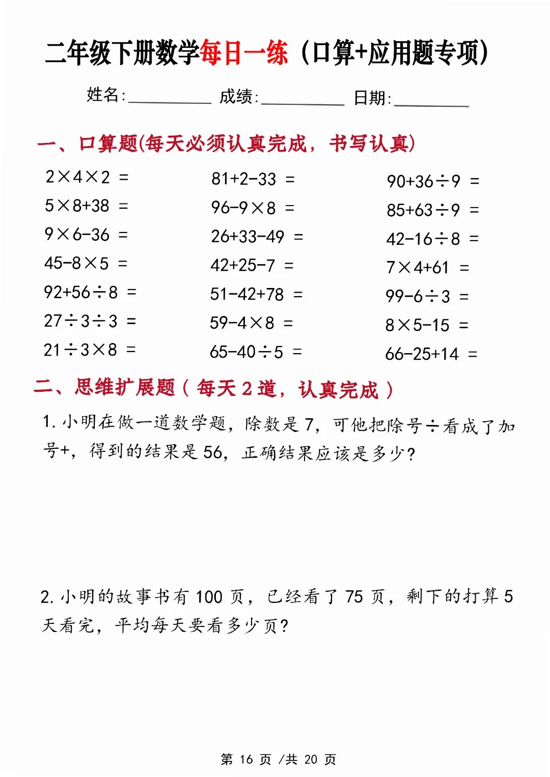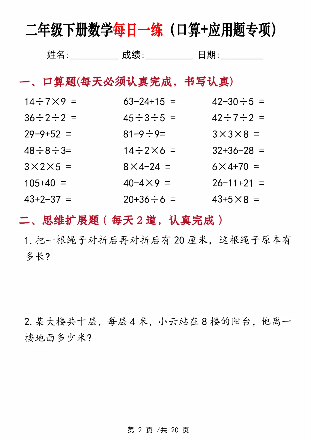 【通用版】二年级下册数学《口算+思维应用题每日一练》,需要的家长抓紧领取一份给孩子打印🖨️出来,让孩子练一练吧✍🏻欢迎分享到班级群或朋友圈,方便家长打印出来助力孩子高效学习!