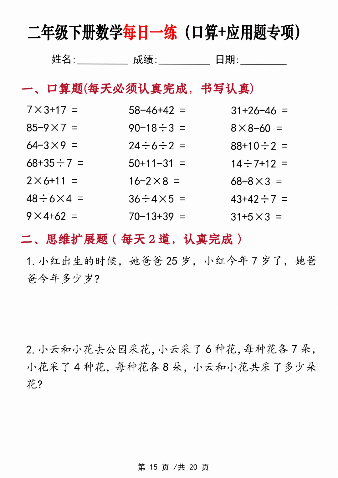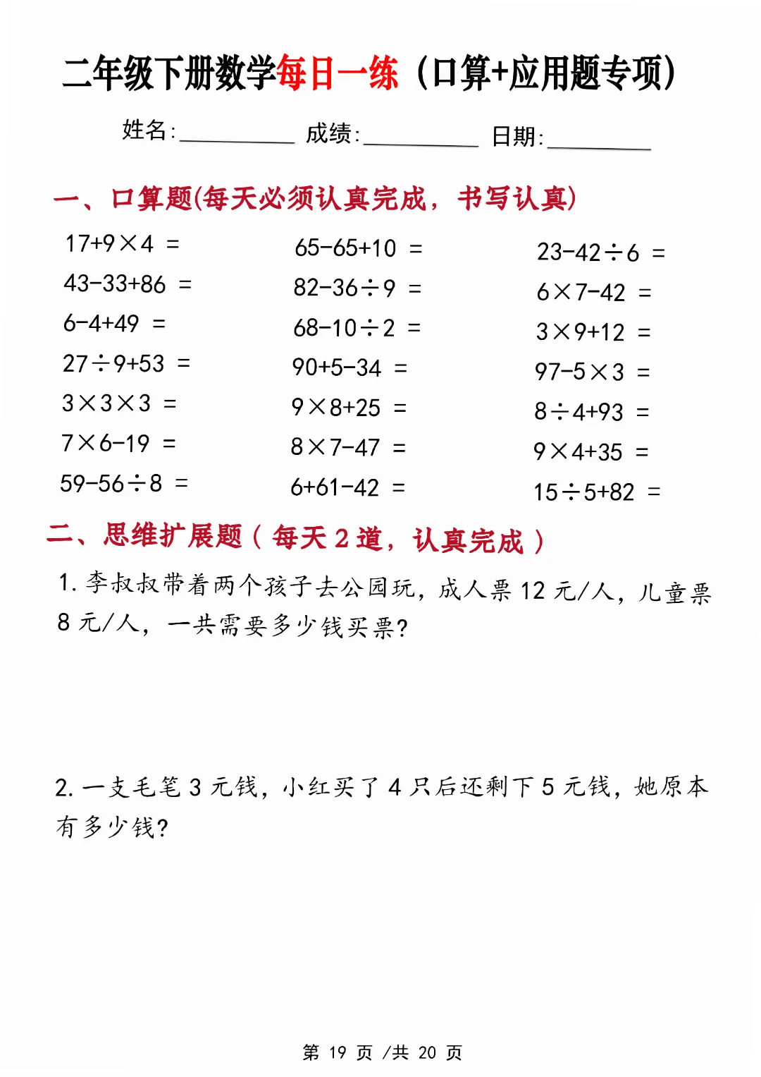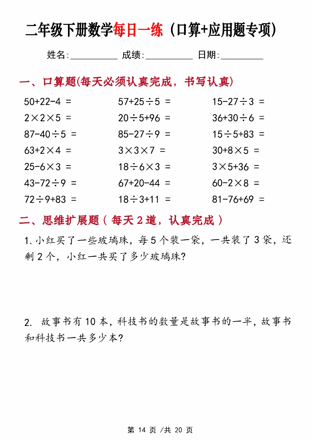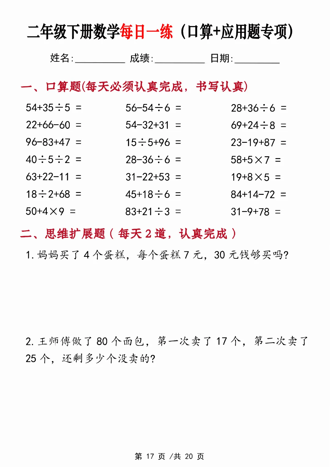 【通用版】二年级下册数学《口算+思维应用题每日一练》,需要的家长抓紧领取一份给孩子打印🖨️出来,让孩子练一练吧✍🏻欢迎分享到班级群或朋友圈,方便家长打印出来助力孩子高效学习!