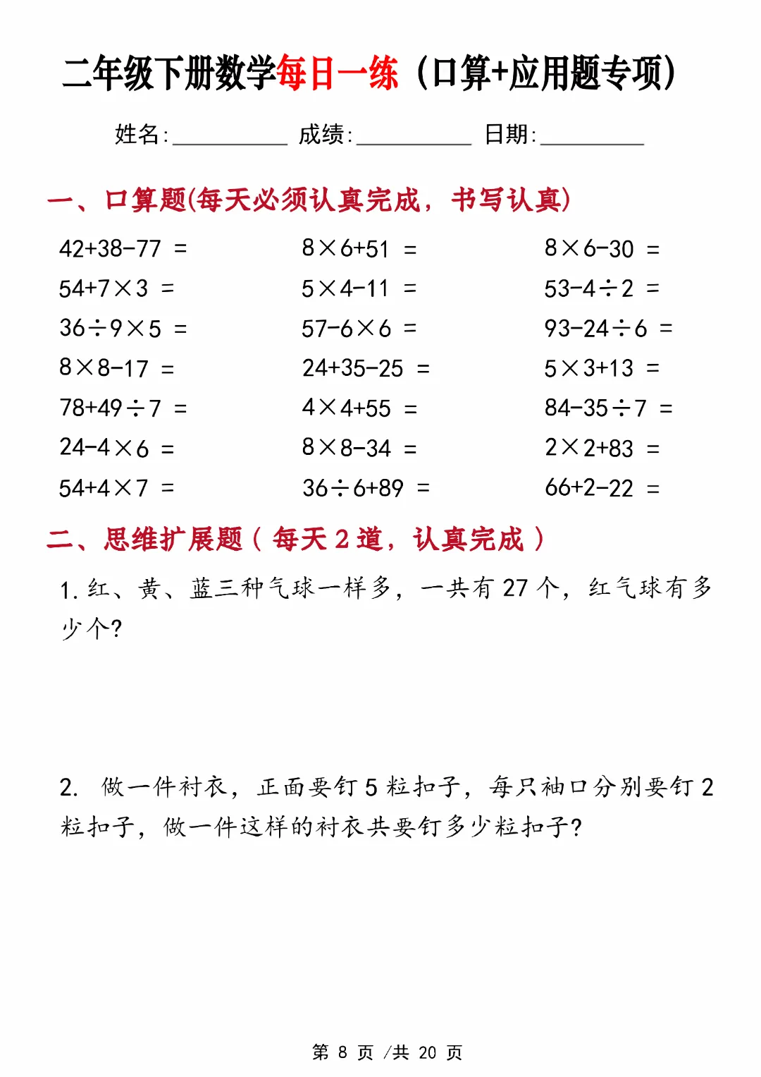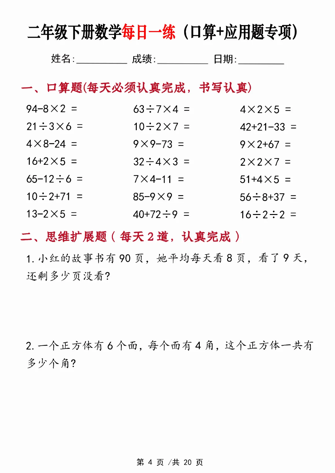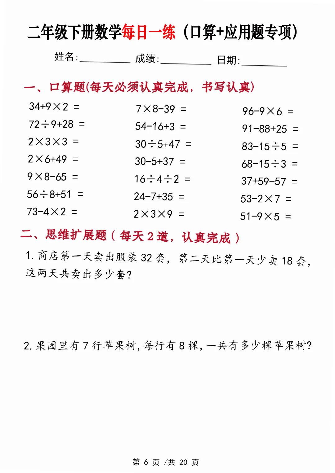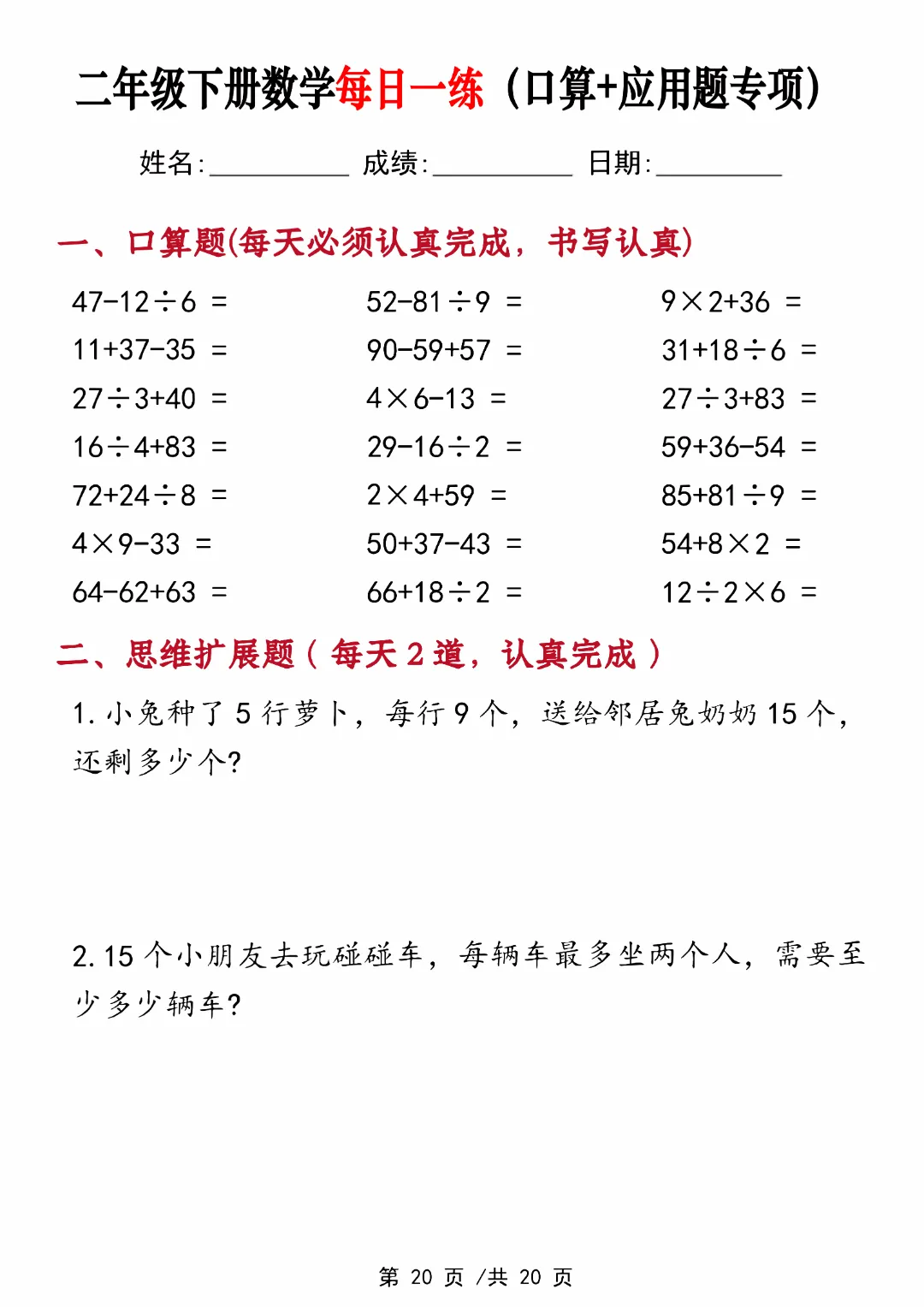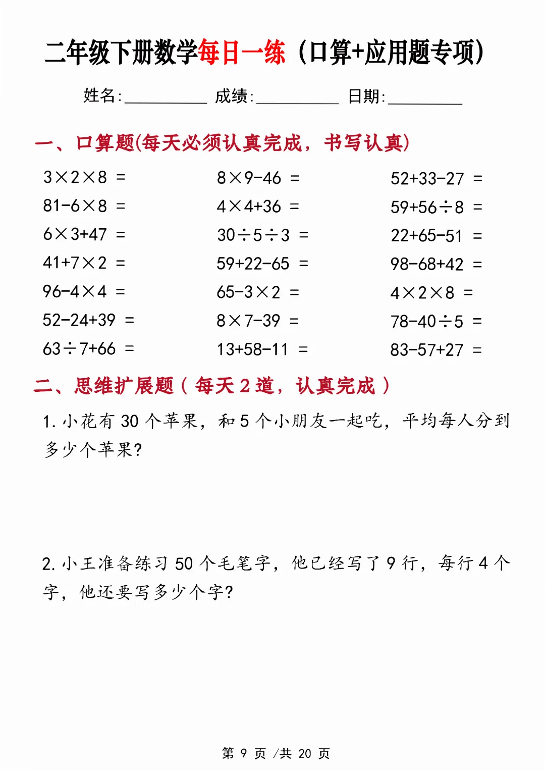 【通用版】二年级下册数学《口算+思维应用题每日一练》,需要的家长抓紧领取一份给孩子打印🖨️出来,让孩子练一练吧✍🏻欢迎分享到班级群或朋友圈,方便家长打印出来助力孩子高效学习!