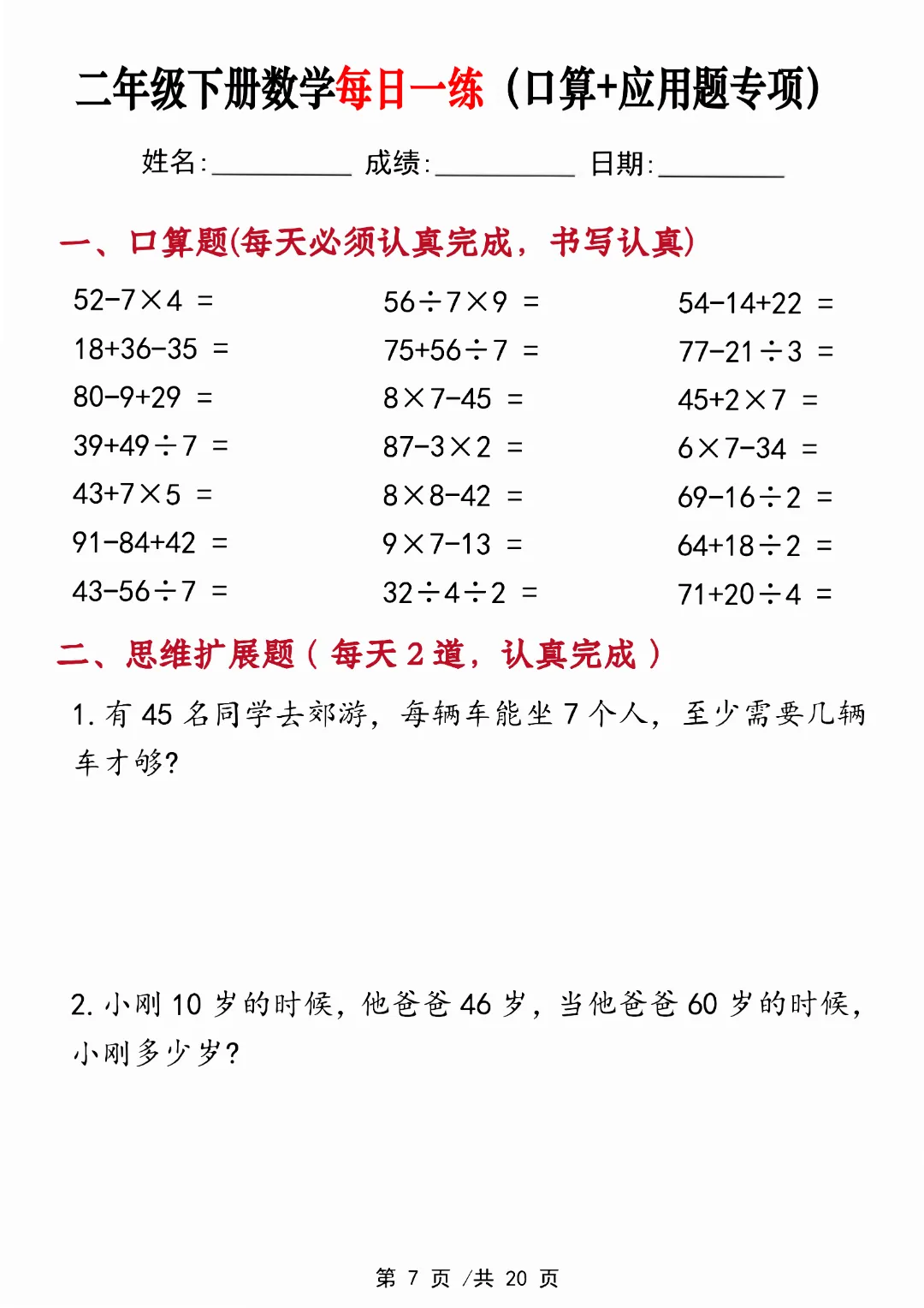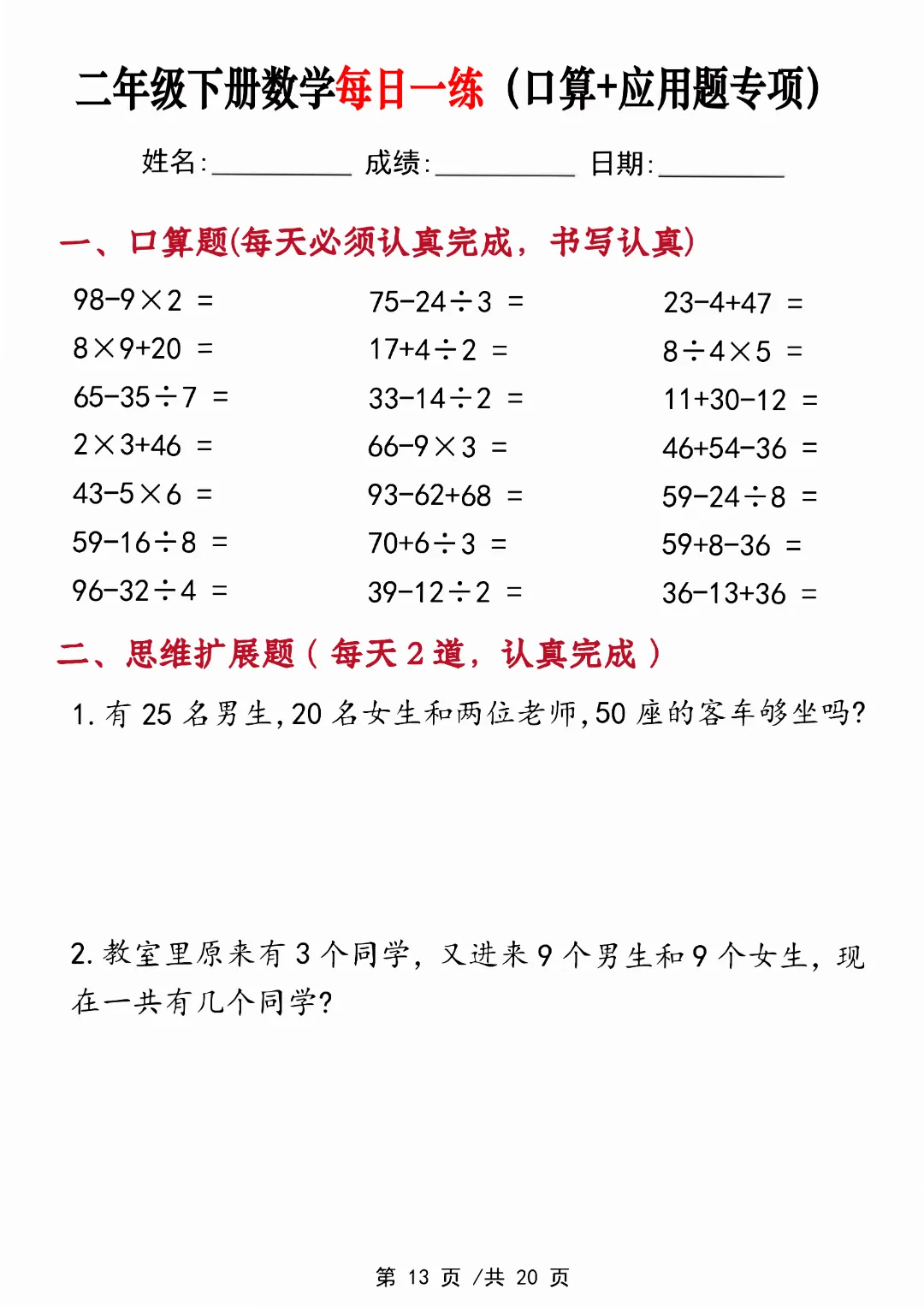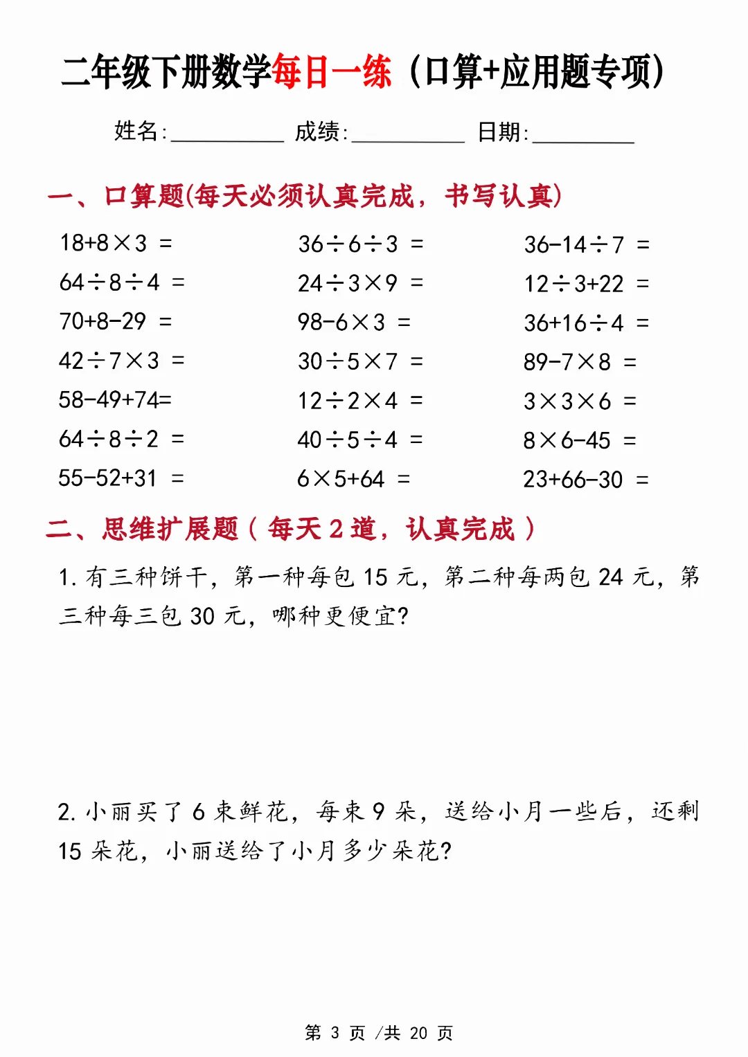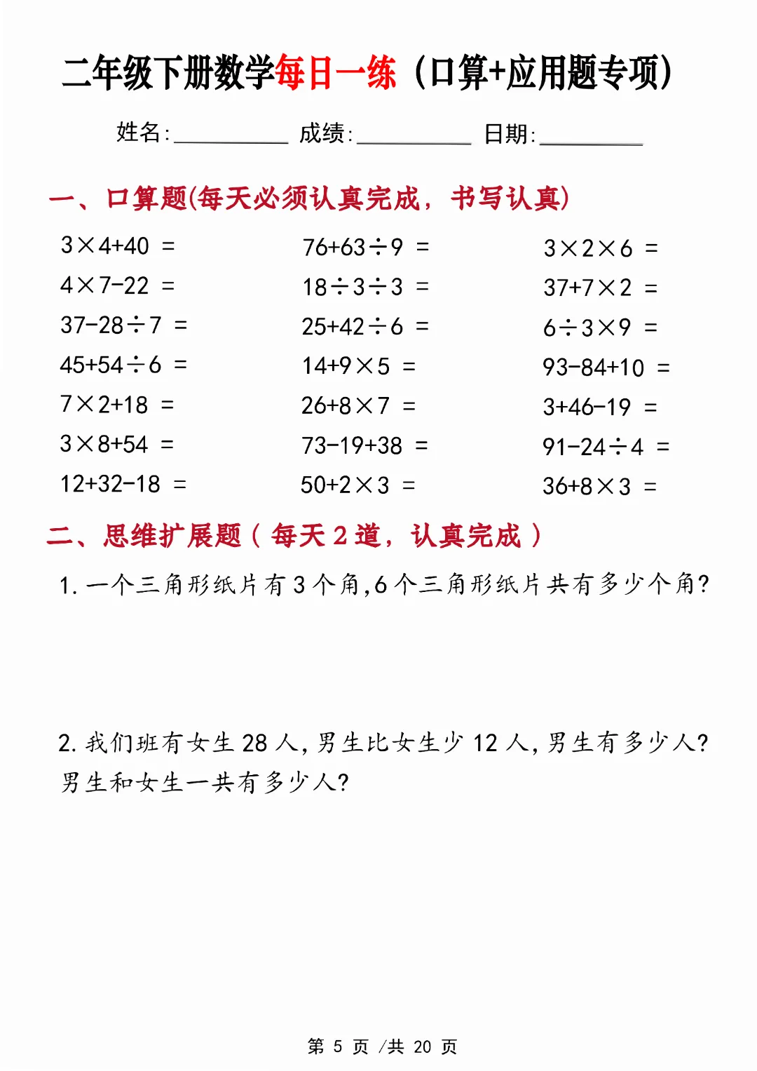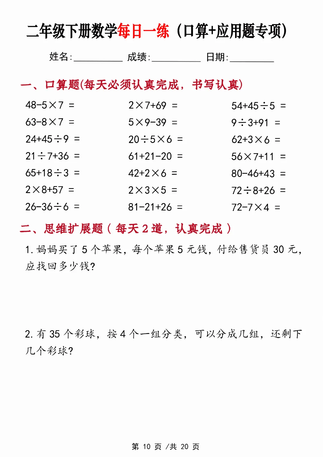 【通用版】二年级下册数学《口算+思维应用题每日一练》,需要的家长抓紧领取一份给孩子打印🖨️出来,让孩子练一练吧✍🏻欢迎分享到班级群或朋友圈,方便家长打印出来助力孩子高效学习!