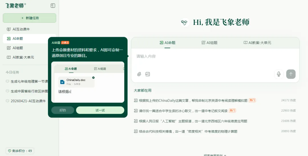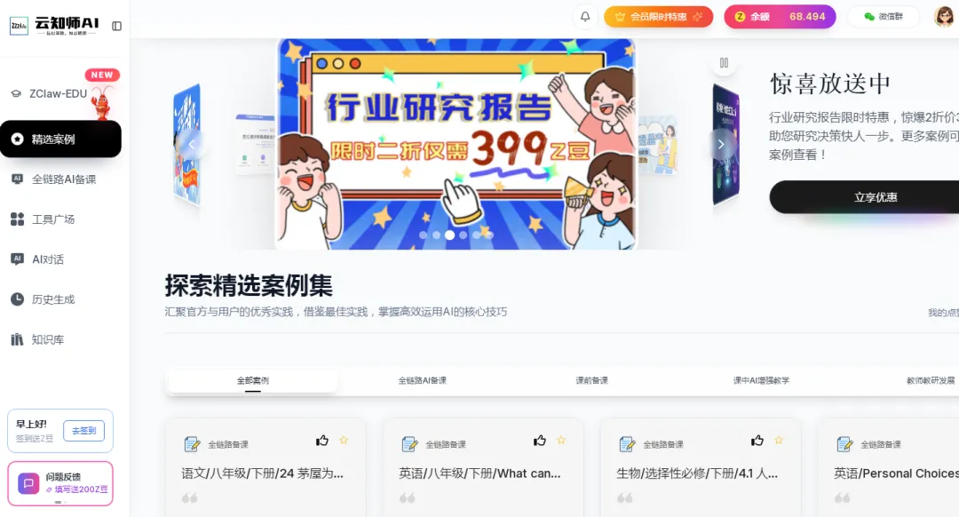 核心功能:AI教学动画、AI互动课件、AI命题与组题、AI教案、创意社区(超过3万个案例模板)。教师们可以在此浏览、分享、复用其他老师的优秀创作,快速套用到自己的新课准备中。