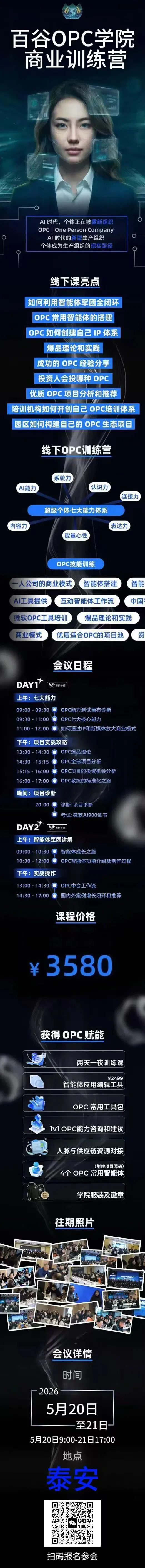为了帮你抓住这波个体崛起的红利,百谷 OPC 学院商业训练营正式开启招募!两天,从底层逻辑到实战操作,从智能体搭建到项目诊断,带你系统性掌握 AI 时代个体创业的核心能力,把 “逆袭风口” 变成你自己的商业机会。