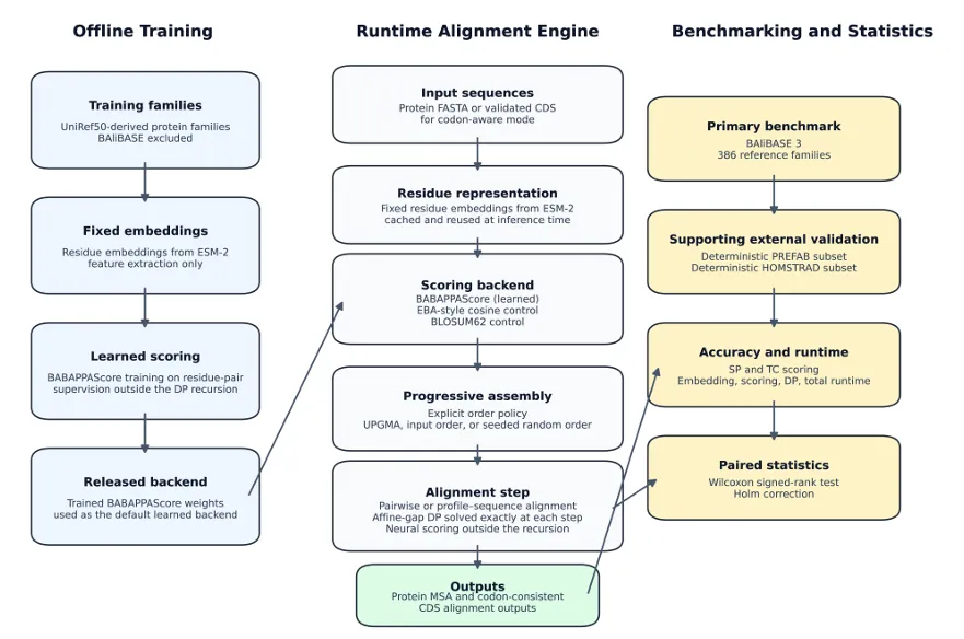 BABAPPAlign 是一款深度学习赋能的新型多序列比对引擎,打破传统比对软件的打分局限,依托蛋白大模型与机器学习提升比对灵敏度与准确度,同时兼容常规蛋白比对与密码子联合比对需求。软件完全开源、部署便捷,综合性能优于主流传统工具,为复杂蛋白序列、低同源序列的精准比对提供全新高效的分析选择。