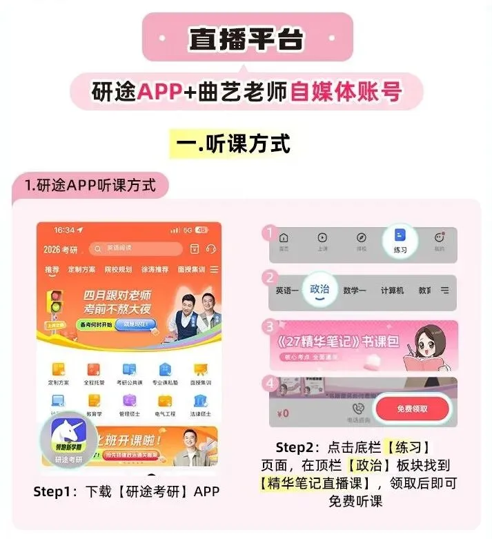 下载并打开「研途考研」APP,点击底栏【练习】页面,在【政治】板块找到《27 精华笔记》书课包,领取后即可免费听课、回看。 - 微博
