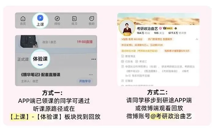 微博:移步 @考研政治曲艺 账号主页,可查看直播回放内容
