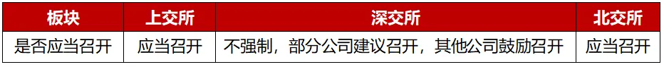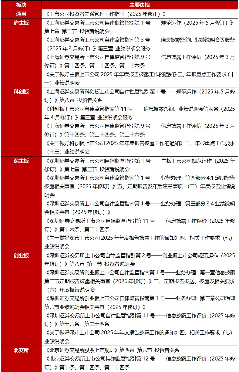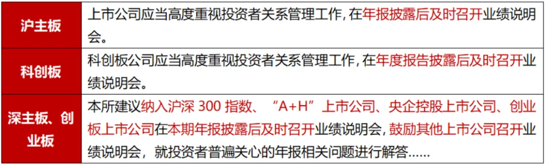沪主板、科创板均要求在年报披露后及时召开业绩说明会,深主板、创业板则不强制,建议纳入沪深300指数、“A+H”上市公司、央企控股上市公司、创业板上市公司在年报披露后及时召开业绩说明会,其他上市公司鼓励召开。北交所未在2025年年度报告披露工作的通知中规定,但在《股票上市规则》明确要求,北交所公司应当在不晚于年度股东会召开之日举办年度业绩说明会。