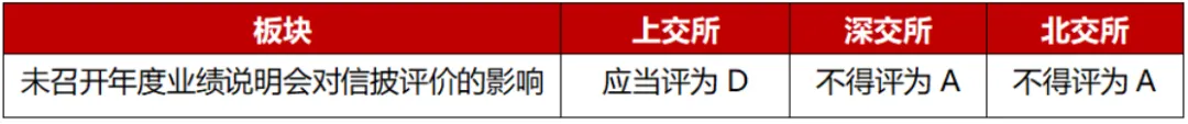 深交所、北交所规定公司未召开年度业绩说明会的,信息披露工作评价结果不得评为A。上交所明确公司未在半年度报告和三季度报告披露后,分别召开半年度报告业绩说明会和三季度报告业绩说明会的,评价结果不得为A;未在年度报告披露后召开年度报告业绩说明会,或存在应当召开投资者说明会的相关情形,但未按规定召开投资者说明会的,评价结果应当为D。