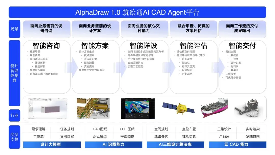 目前,筑绘通已经历七次关键迭代,基于大语言模型、深度学习识图引擎、生成式设计引擎与云端建模引擎的技术底层,具备云CAD、AI识图、设计大模型与AI设计agent能力,现已应用于建筑、电力工程、船舶等工程项目的排布设计与图纸绘制。