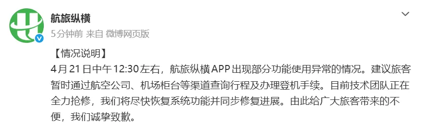 4月21日中午12:30左右,航旅纵横APP出现部分功能使用异常的情况。建议旅客暂时通过航空公司、机场柜台等渠道查询行程及办理登机手续。目前技术团队正在全力抢修,我们将尽快恢复系统功能并同步修复进展。由此给广大旅客带来的不便,我们诚挚致歉。