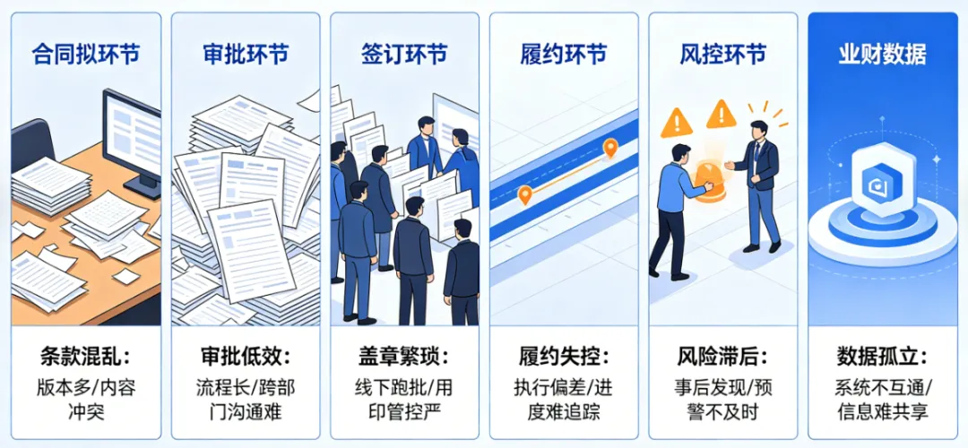 传统合同管理的痛点,几乎贯穿全流程始终: