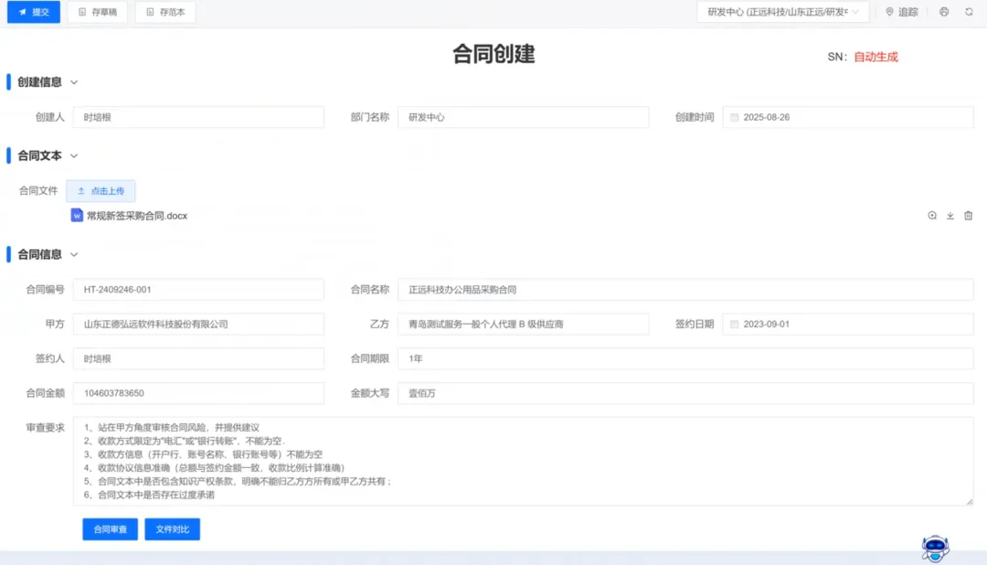 面对碎片化、低效的管理困局,正远数智基于自身的合同一体化解决方案,打造了企业AI智能合同助理。作为您的专属法务专家,它帮助企业实现合同的起草、审查、比对等关键环节的智能化升级。过去复杂耗时的合同审查与比对,现在5分钟就能完成——真正把合同管理从负担变成底气。
