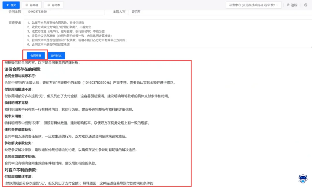 正远合同管理系统的AI 智能审查可实现合同条款的全方位智能校验。系统内置合规规则库与风险识别模型,支持对合同中的付款条件、违约责任、管辖条款、合规条款等进行全维度审查并提供修改建议。