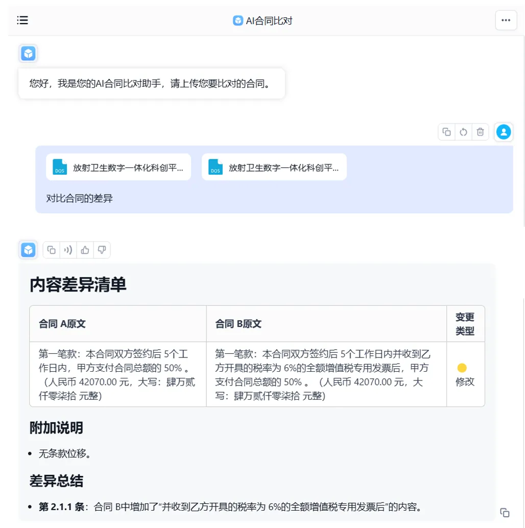 合同签订与履约过程中,版本变更、条款修改十分常见。人工比对不仅速度慢,还难以发现细微差异,极易引发阴阳合同、条款不一致等重大合规隐患。