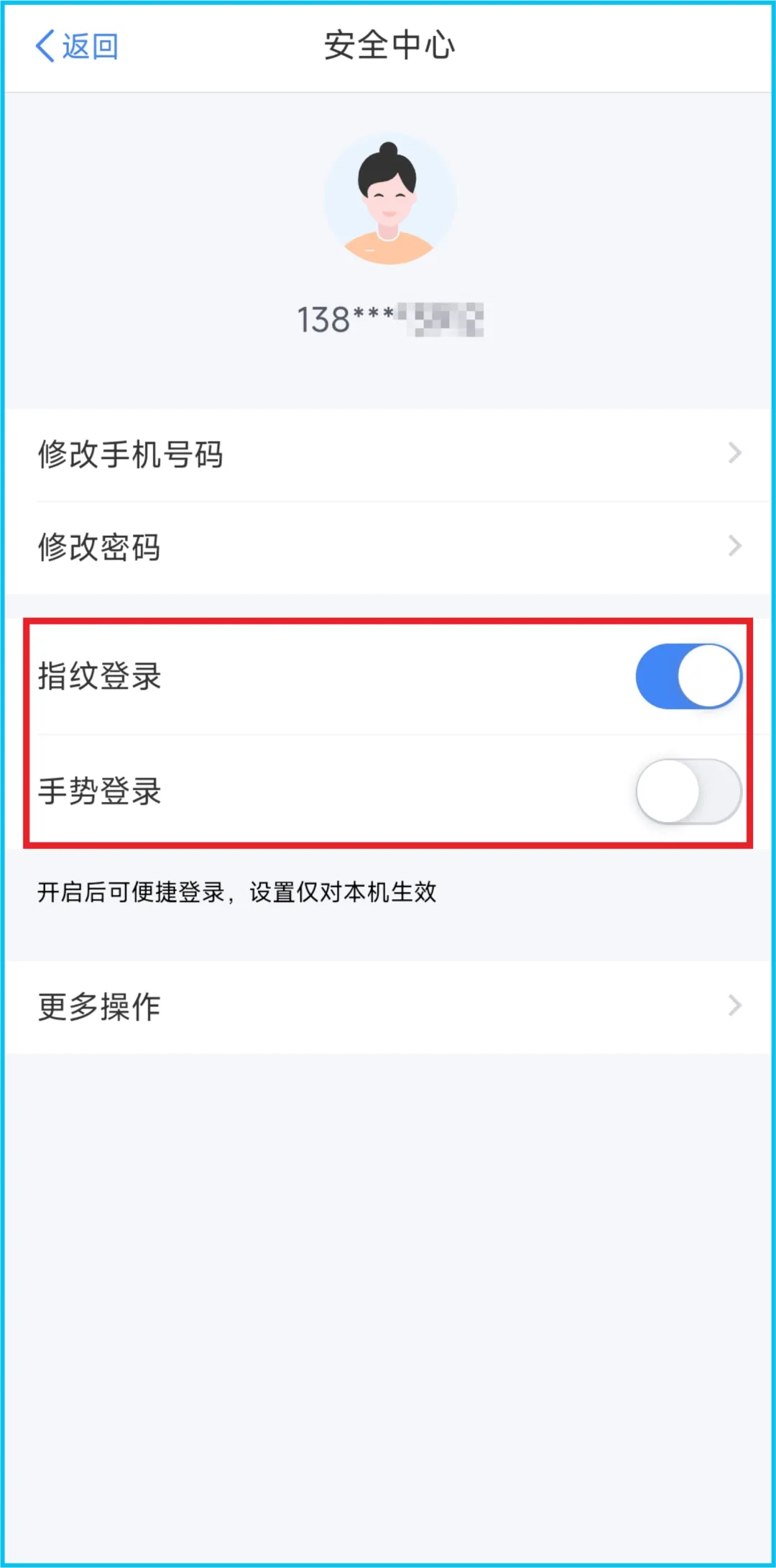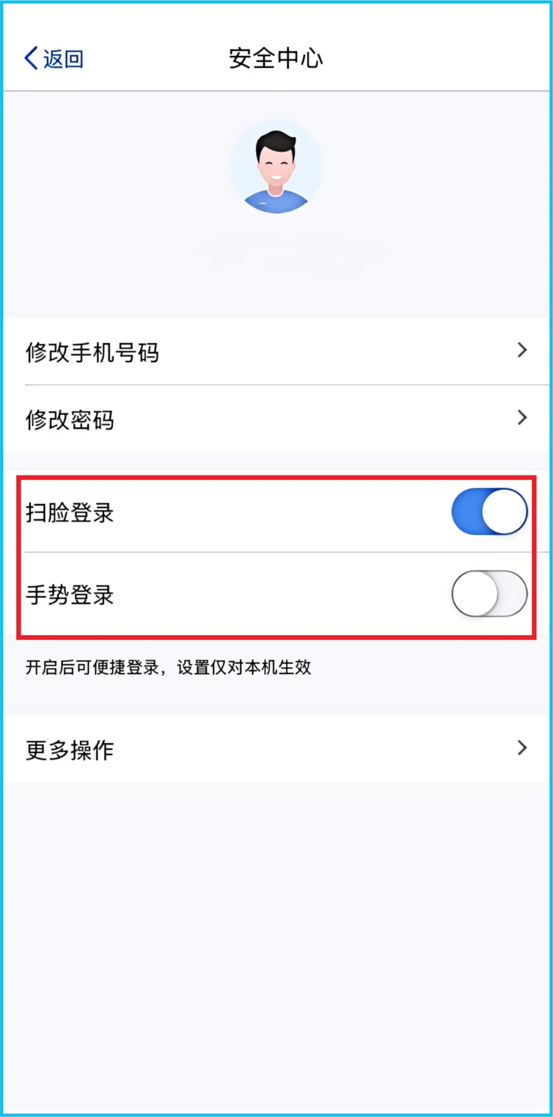 建议通过【安全中心】设置“扫脸登录”“指纹登录”“手势登录”等便捷登录方式。