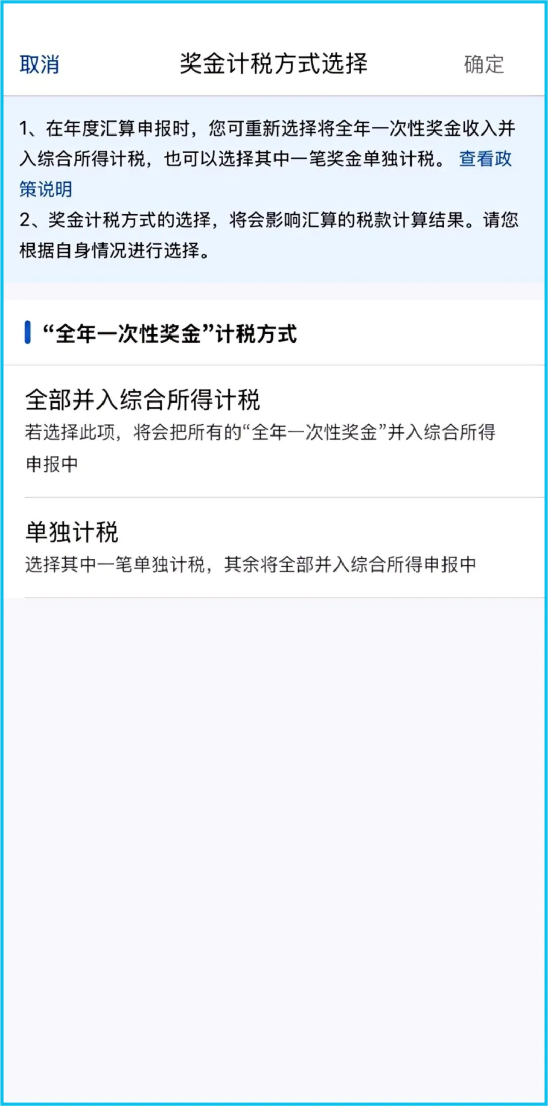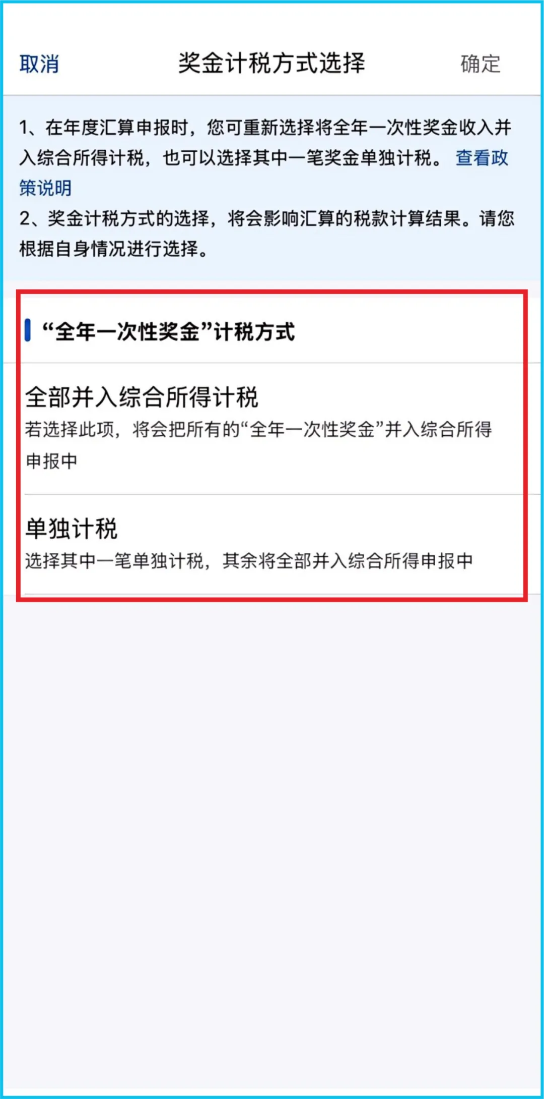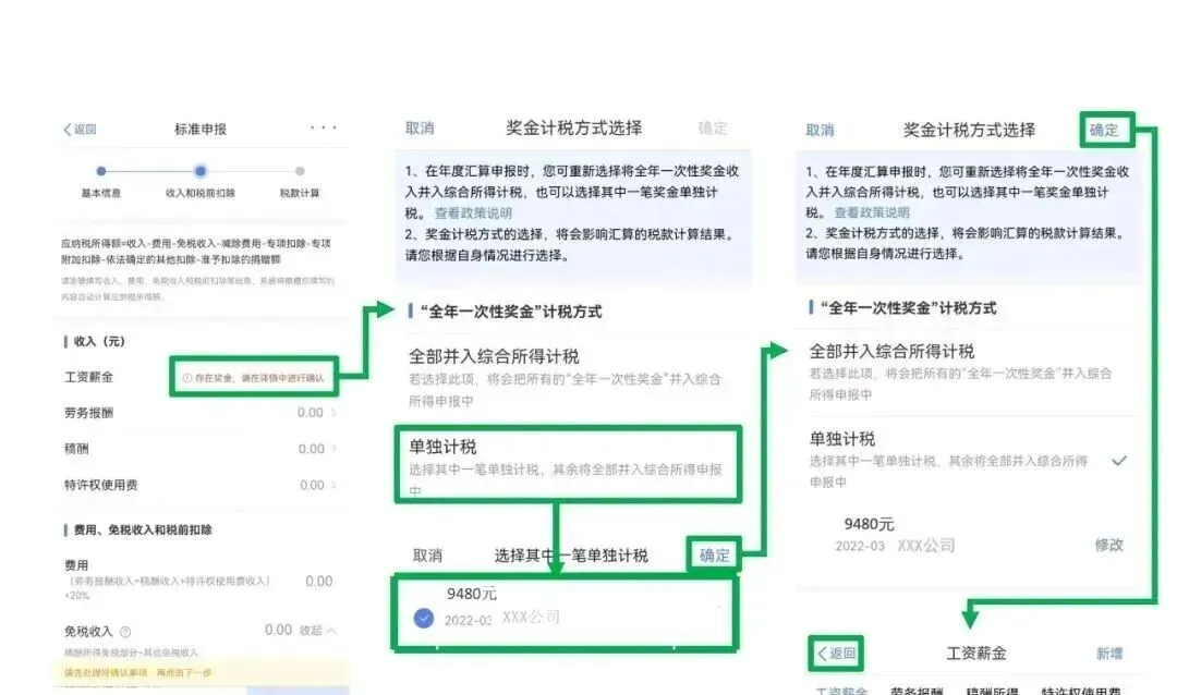 如存在“全年一次性奖金”,点击【工资薪金】进入详情页设置计税方式,建议根据自身情况进行选择。